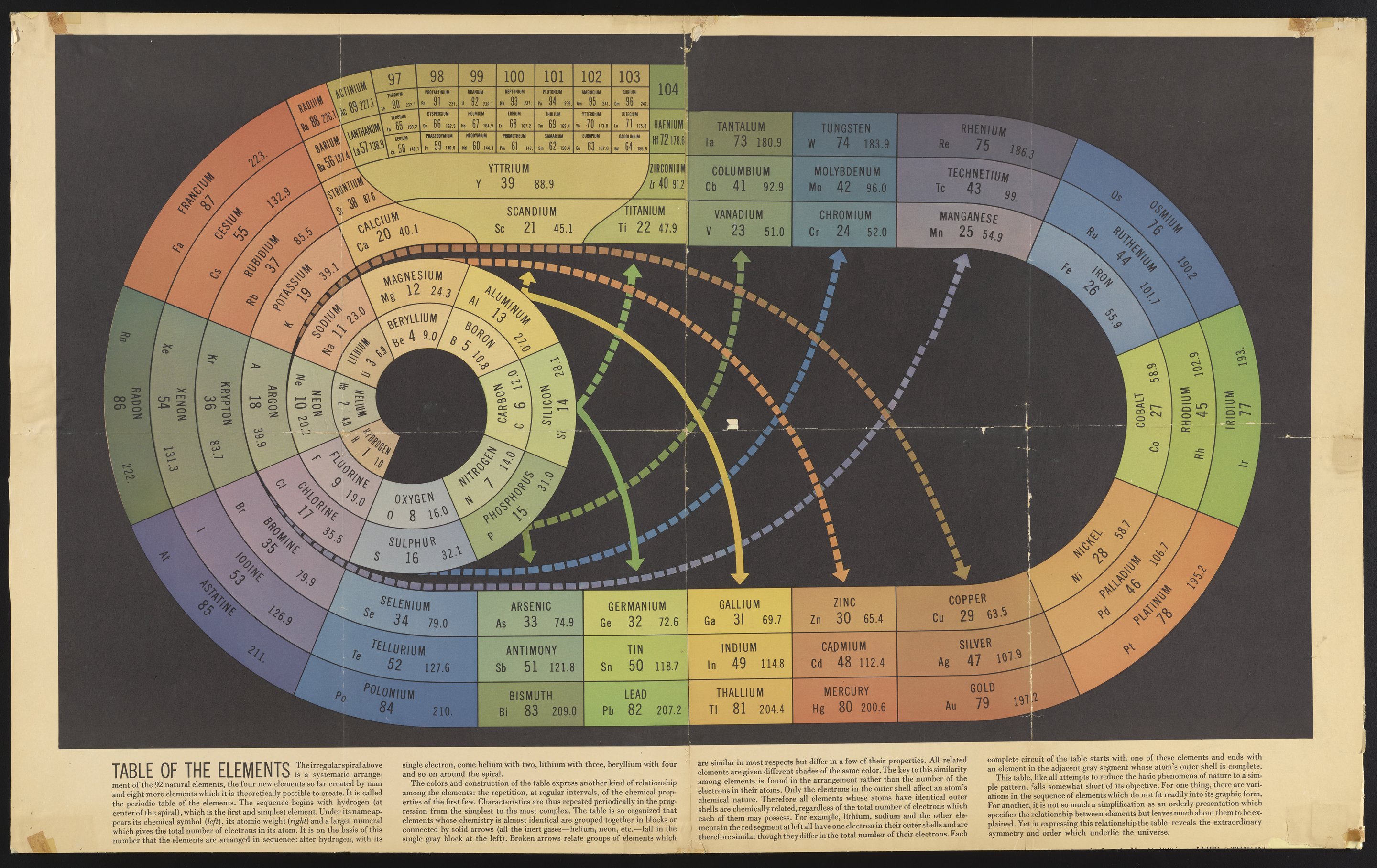 “Table of the Elements in an Irregular Spiral,” 1940–1949. Folder Flat File 2. Science History Institute. Philadelphia. https://digital.sciencehistory.org/works/m326m295x.