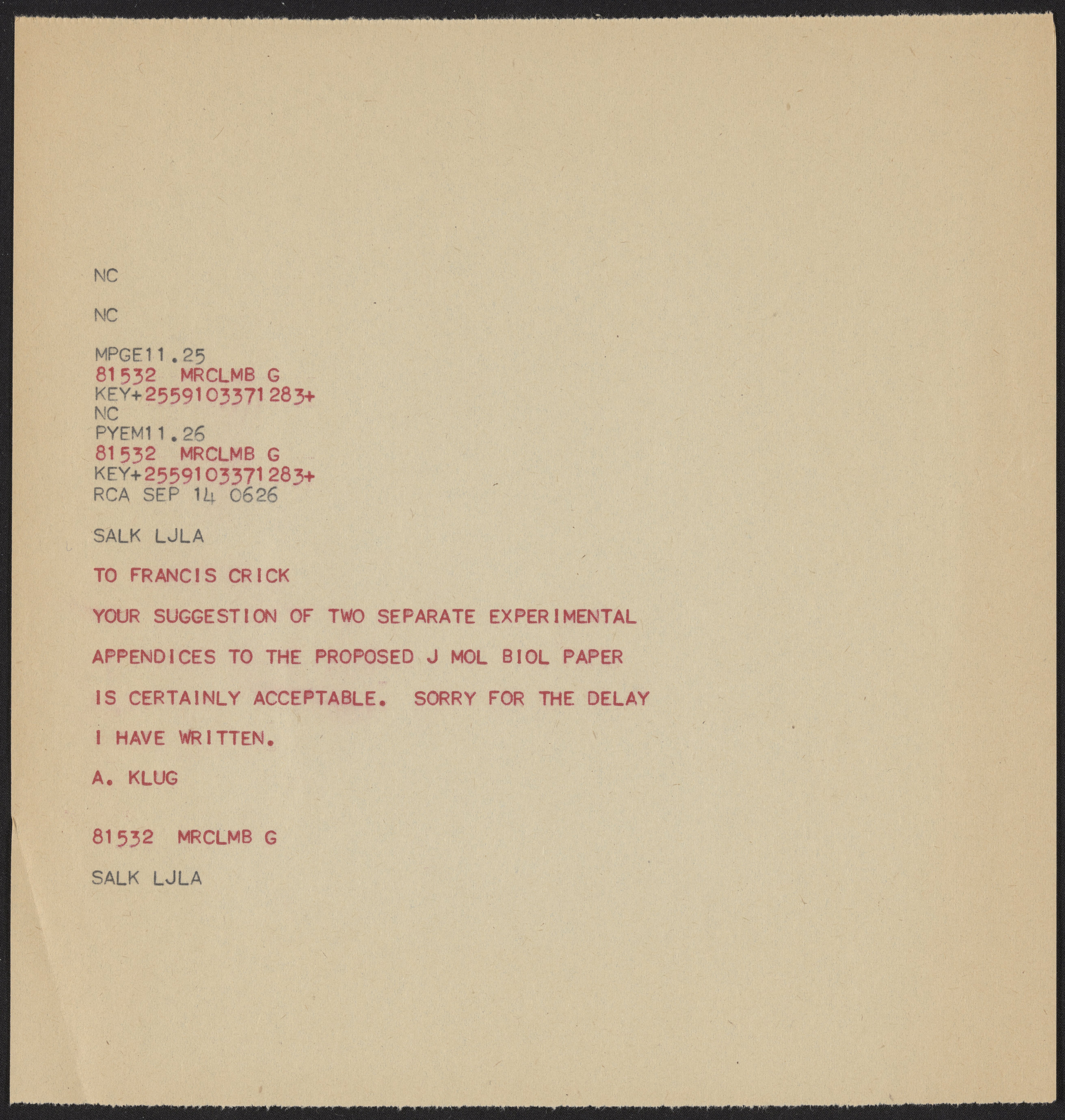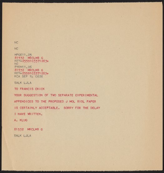 Klug, A. (Aaron), Sir. “Telex from Aaron Klug to Francis Crick, September 14, 1978,” September 14, 1978. History of Molecular Biology Collection, Box 20, Folder 2. Science History Institute. Philadelphia. https://digital.sciencehistory.org/works/m5o3k16.