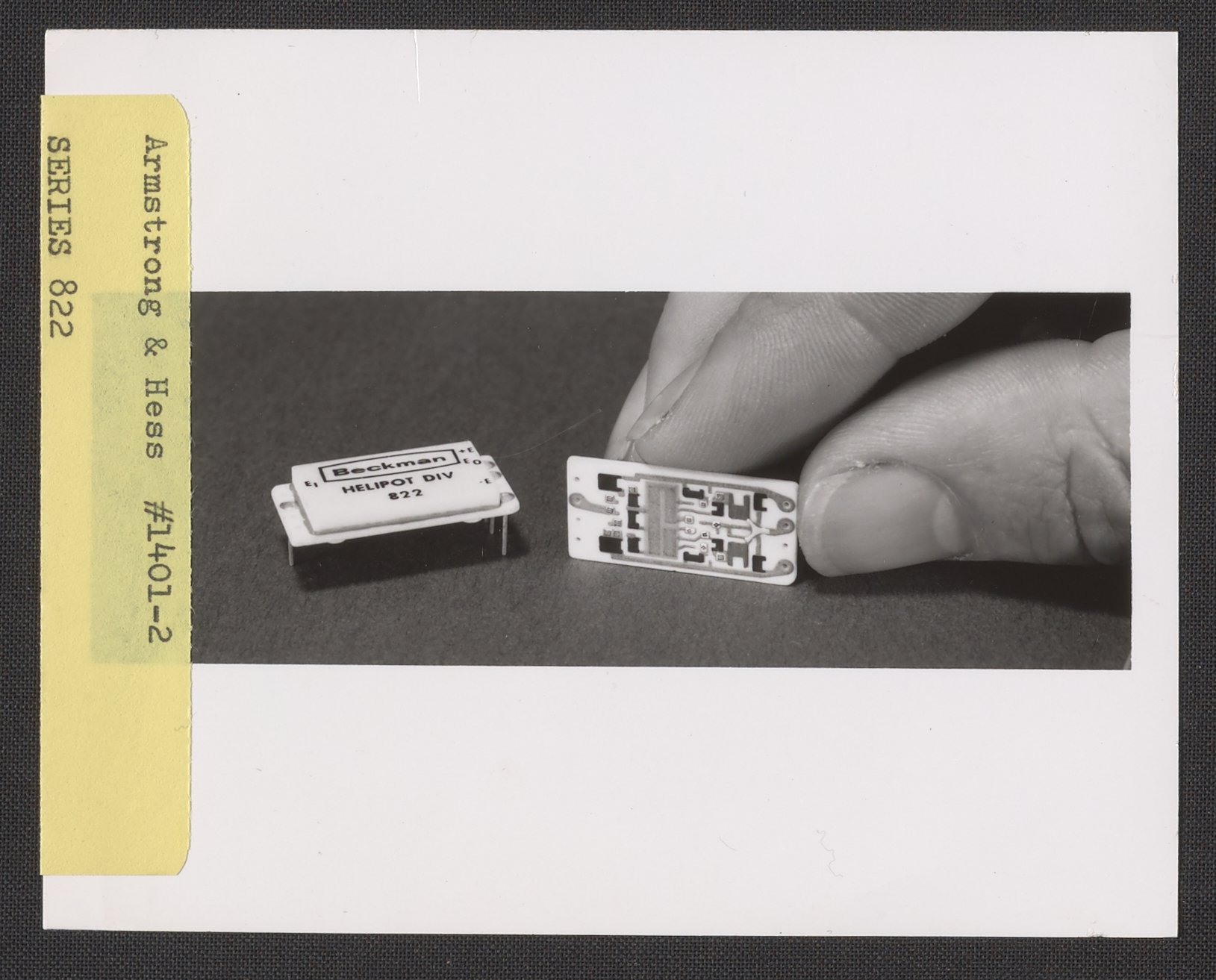 Armstrong & Hess. “Hand Holding a Beckman Series 822 Voltage Regulator,” 1950–1969. Beckman Historical Collection, Box 85. Science History Institute. Philadelphia. https://digital.sciencehistory.org/works/m613mx85j.