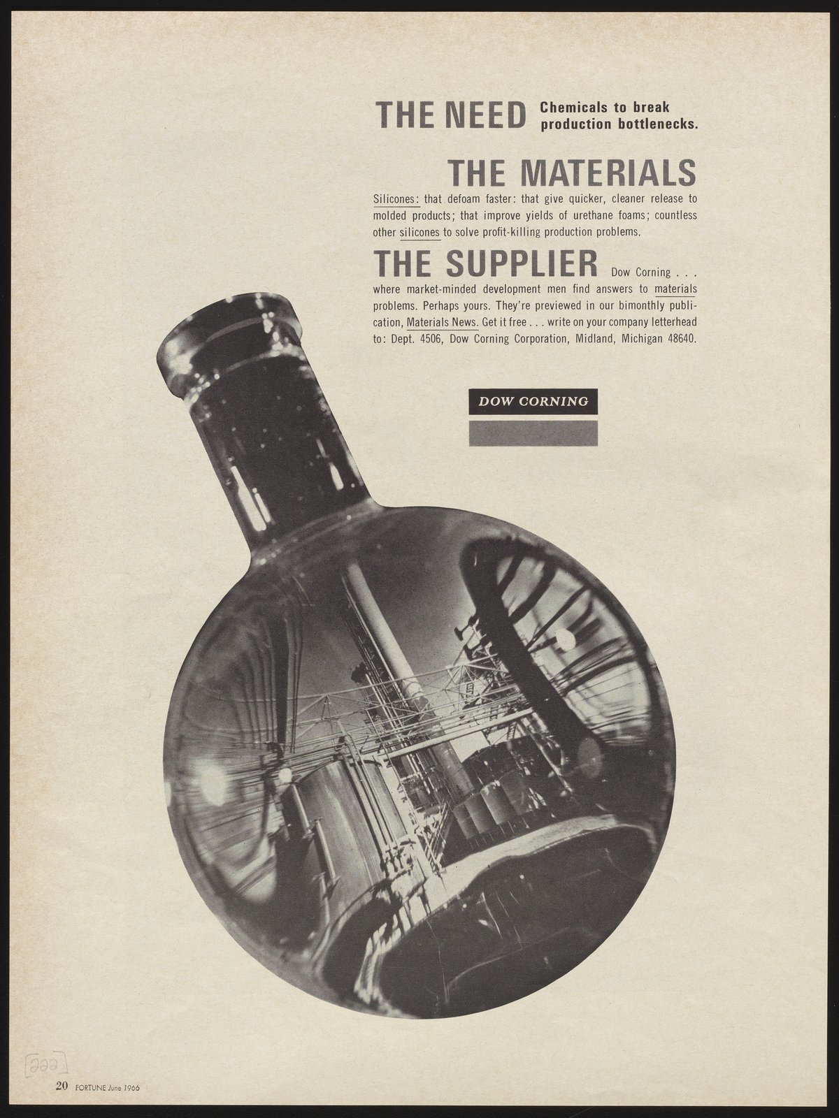 Dow Corning Corporation. “The Need: Chemicals to Break Production Bottlenecks,” June 1966. Advertisements from the Dow Chemical Historical Collection, Box 7. Science History Institute. Philadelphia. https://digital.sciencehistory.org/works/m613mz17m.