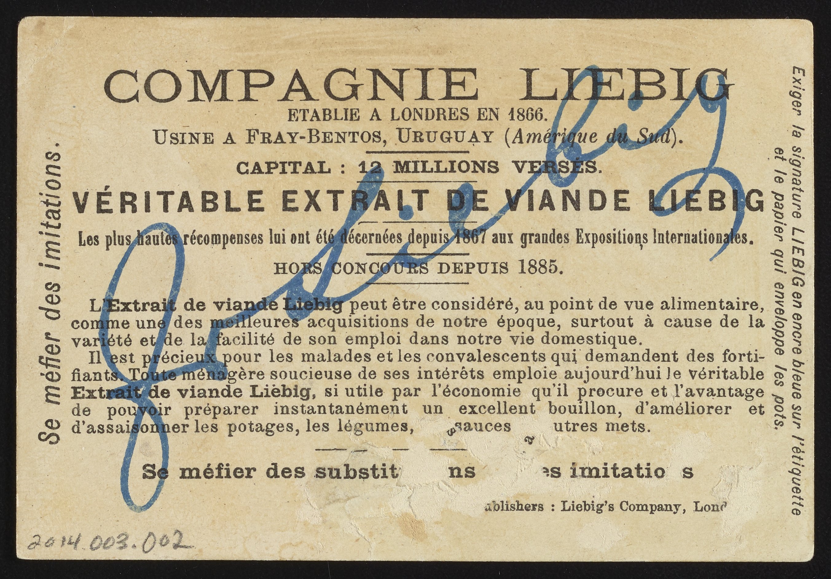 Liebig's Extract of Meat Company was founded in 1865 by Justus von Liebig and George Christian Giebert. While the product was produced exclusively in Uruguay, it was extremely popular in Europe with 500 tons of the product being produced every year in the late 1870s. The company was very successful, eventually being bought in 1924 by the Vestey Group. In 1968 the company merged with Brooke Bond and then was eventually bought by Unilever in 1984. It was subsequently sold to Premier Foods in 2006.