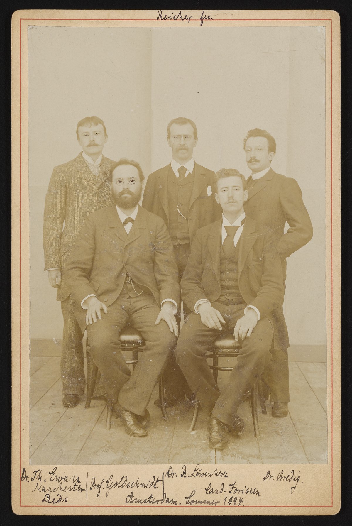 Fading posed photograph of chemists at the University of Amsterdam, possibly at Jacobus van 't Hoff's (1852-1911) laboratory. Pictured standing, left to right are Thomas Ewan, Heinrich Jacob Goldschmidt (1857-1937), Georg Bredig (1868-1944), and seated left to right are R. Lowenherz, and Willem P. Jorissen.