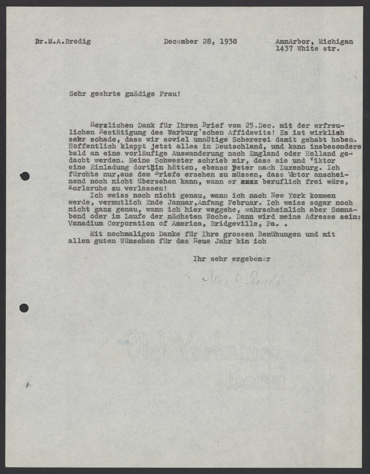 Letter from Max Bredig to Fridel G. Halstead, December 28, 1938