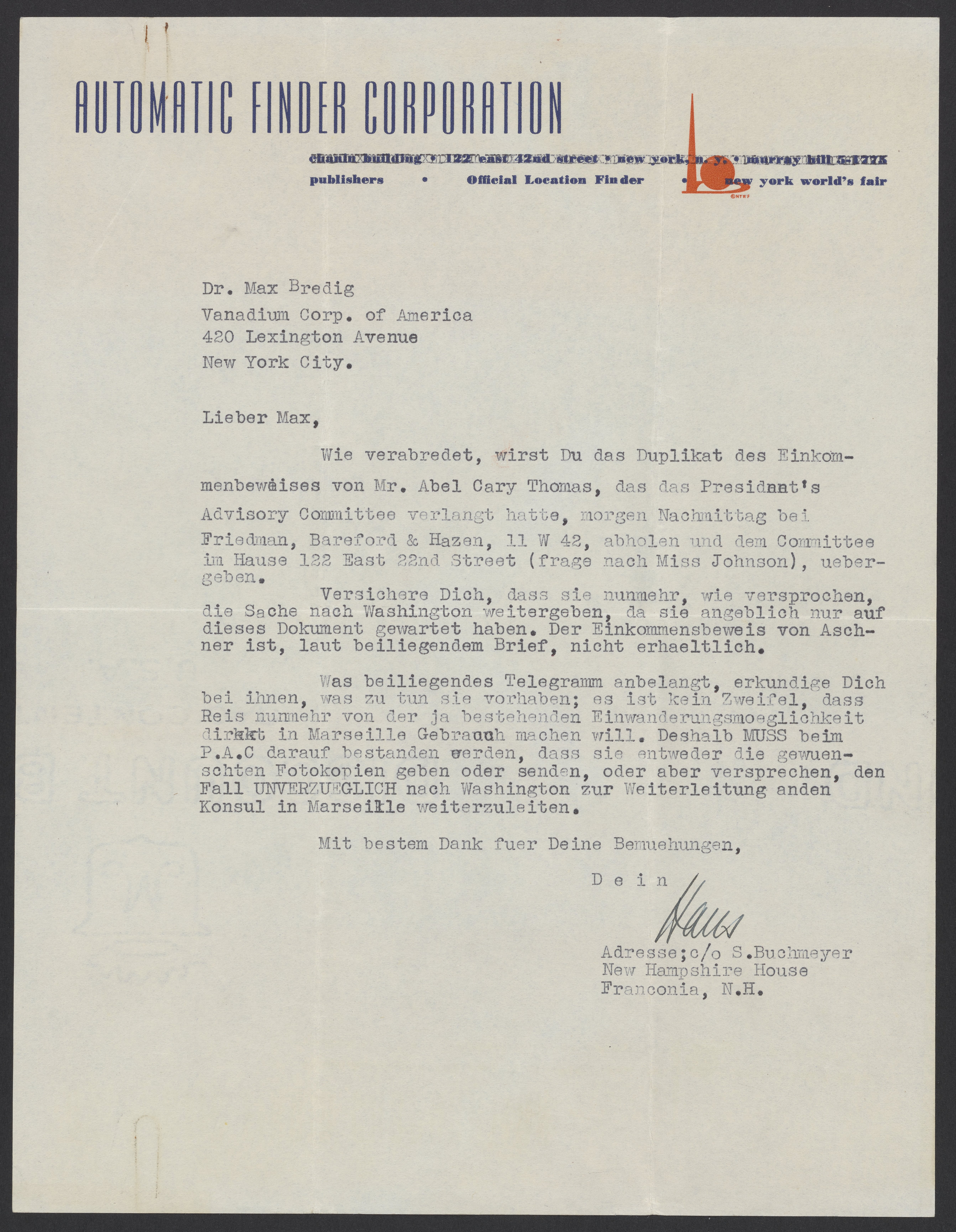 Max Albert Bredig (1902-1977) receives directions on handling papers relating to the immigration of Alfred Reis (1882-1951).