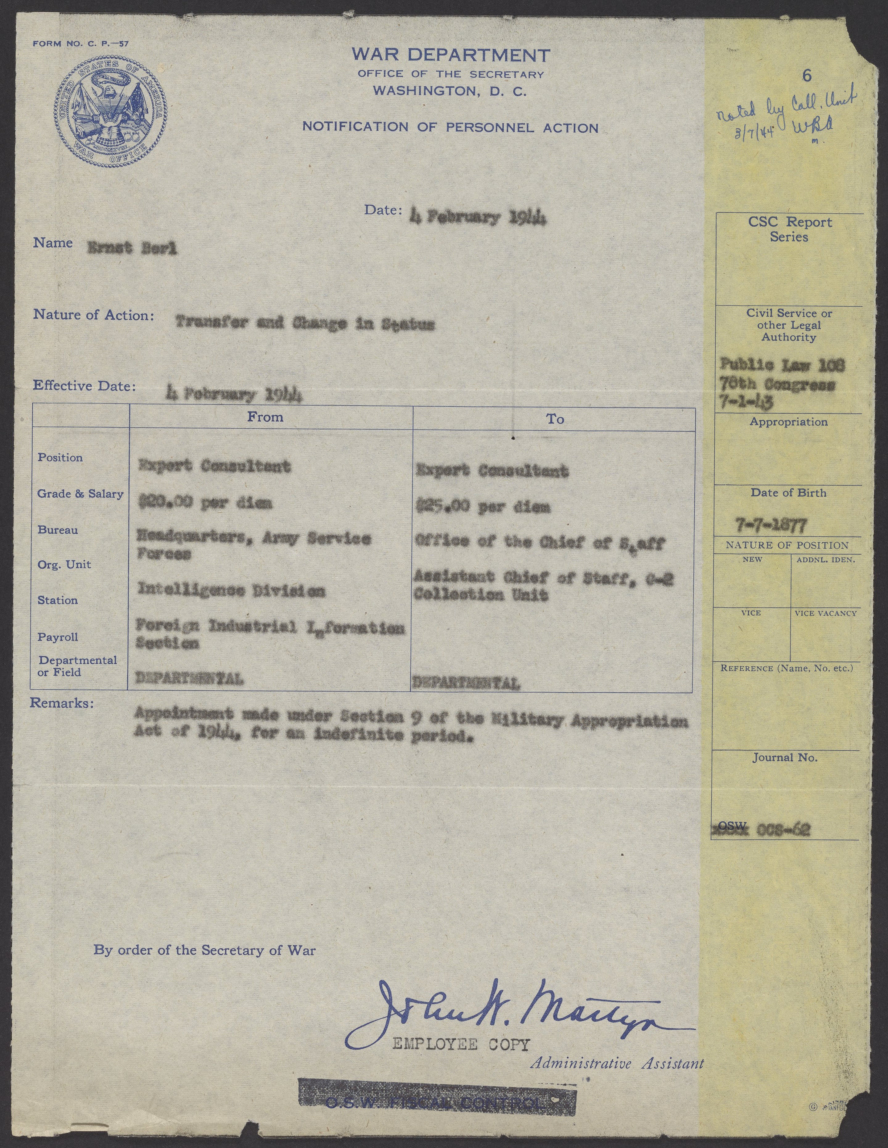 Notification of Personnel Action regarding Ernst Berl, February 4, 1944