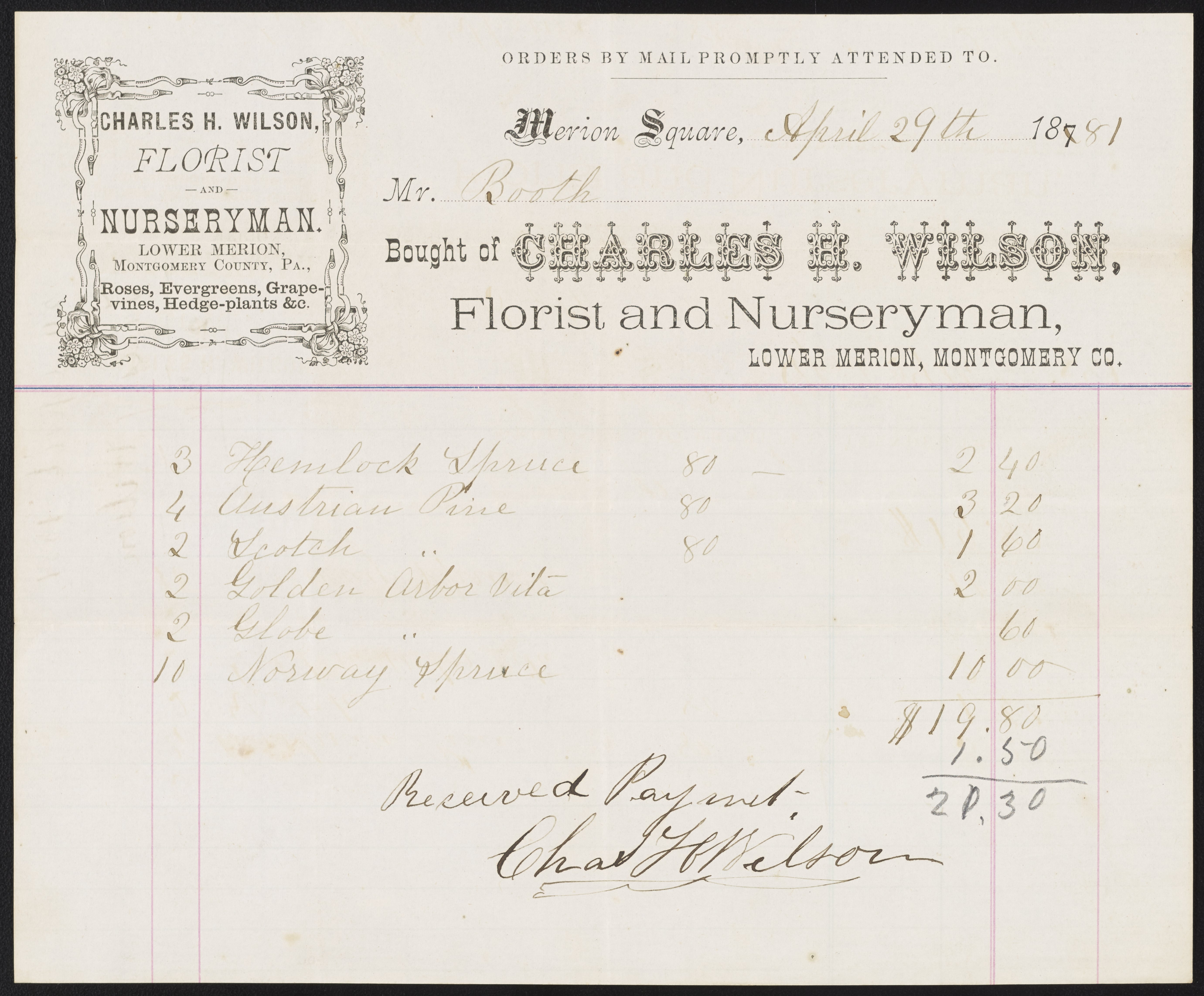 Receipt from Charles H. Wilson, Florist and Nurseryman