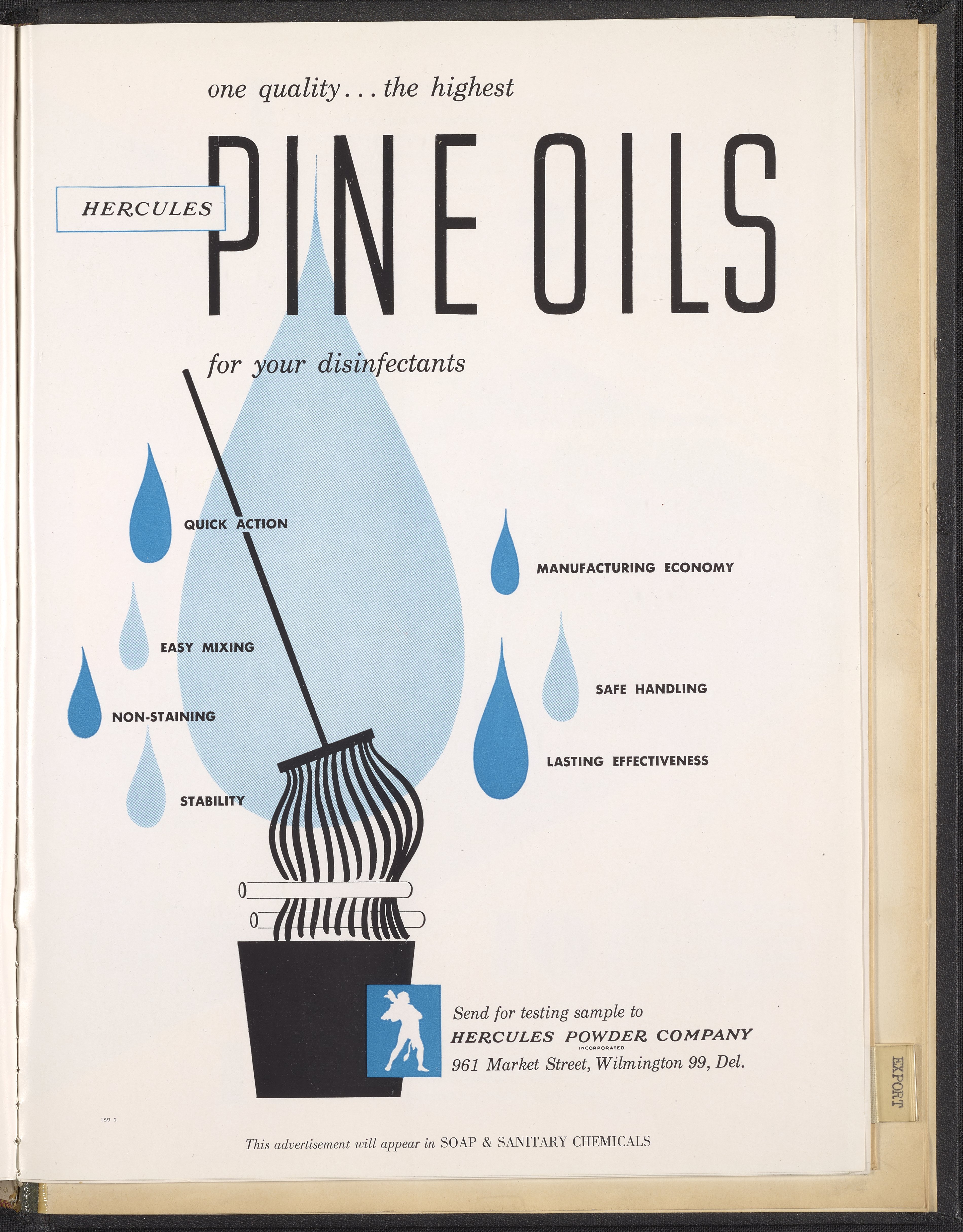 Hercules Incorporated. “Hercules Pine Oils.” 1949 Hercules Advertisements, 1949. Records of Hercules Incorporated, Volume 1949. Science History Institute. Philadelphia. https://digital.sciencehistory.org/works/mc0i5mf.