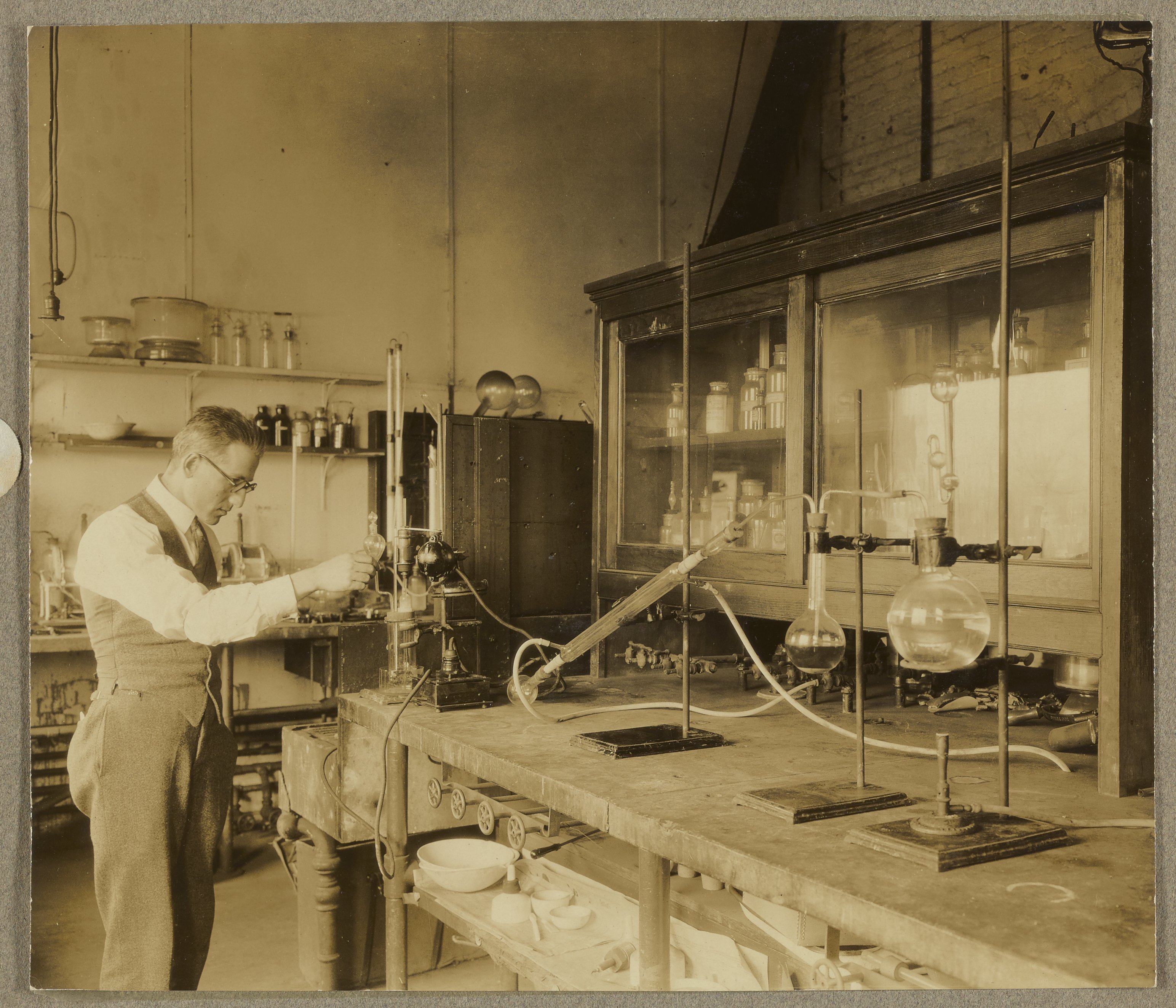 L.A. Pinck demonstrating an apparatus used for the nitration of organic substances at the U.S. Department of Agriculture's Fixed Nitrogen Research Laboratory located in Washington, D.C.