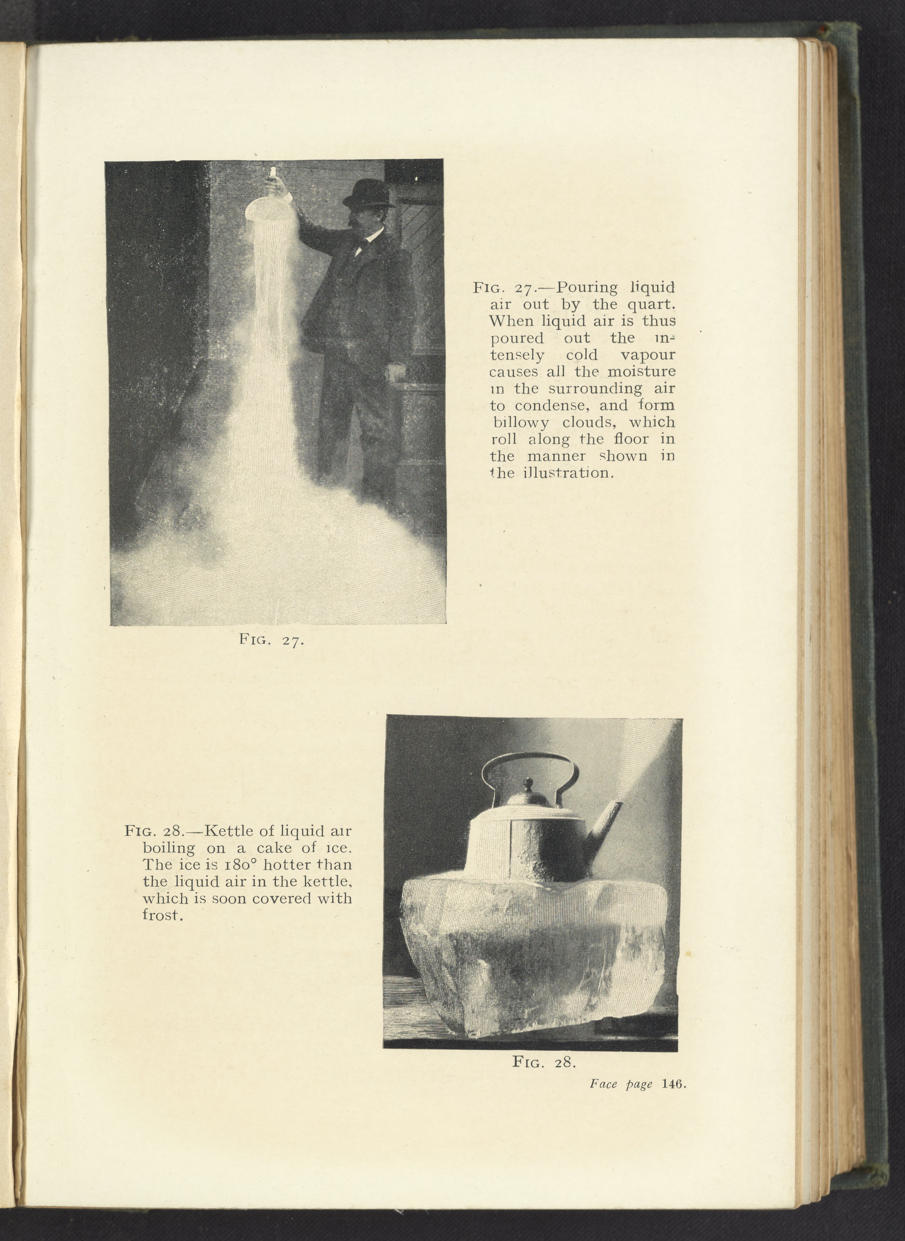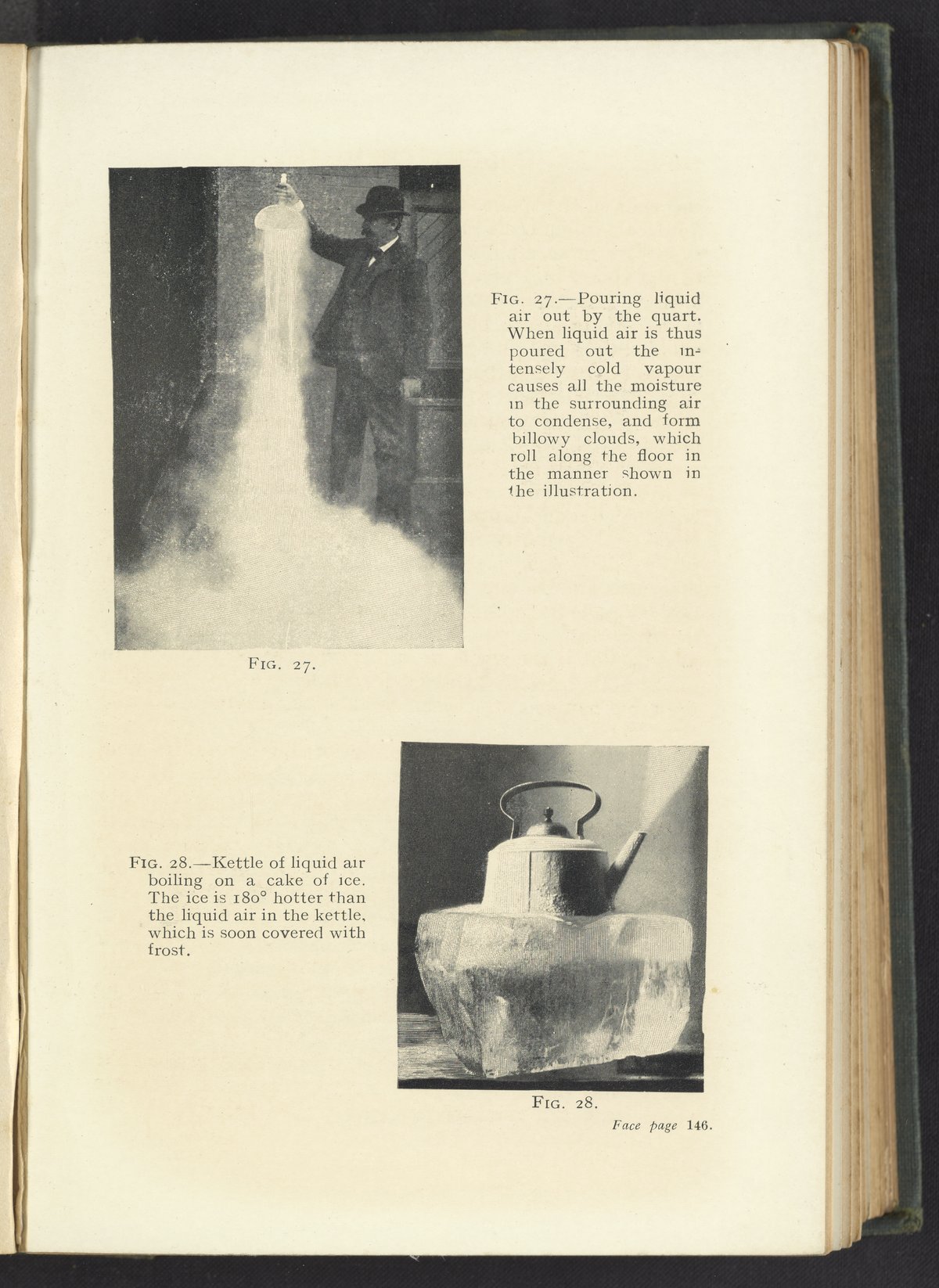 Martin, Geoffrey. “Fig. 27: Pouring Liquid Air; Fig. 28: Kettle of Liquid Air on a Cake of Ice.” Triumphs & Wonders of Modern Chemistry. New York, New York: D. Van Nostrand Company, 1913. https://digital.sciencehistory.org/works/mc87pq74r.