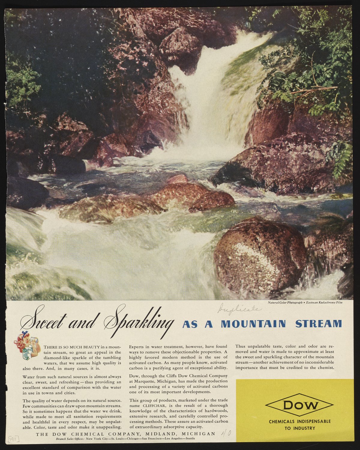 Color print advertisement for a variety of activated carbons manufactured and and sold under the trade name "Cliffchar" by the Cliffs Dow Chemical Company, a subsidiary of the Dow Chemical Company located in Marquette, Michigan. The advertisement depicts a mountain stream, while the accompanying text details the use of charcoal (i.e. activated carbons) to improve the taste, color, and odor of municipal water to better mimic the quality of water from natural sources.