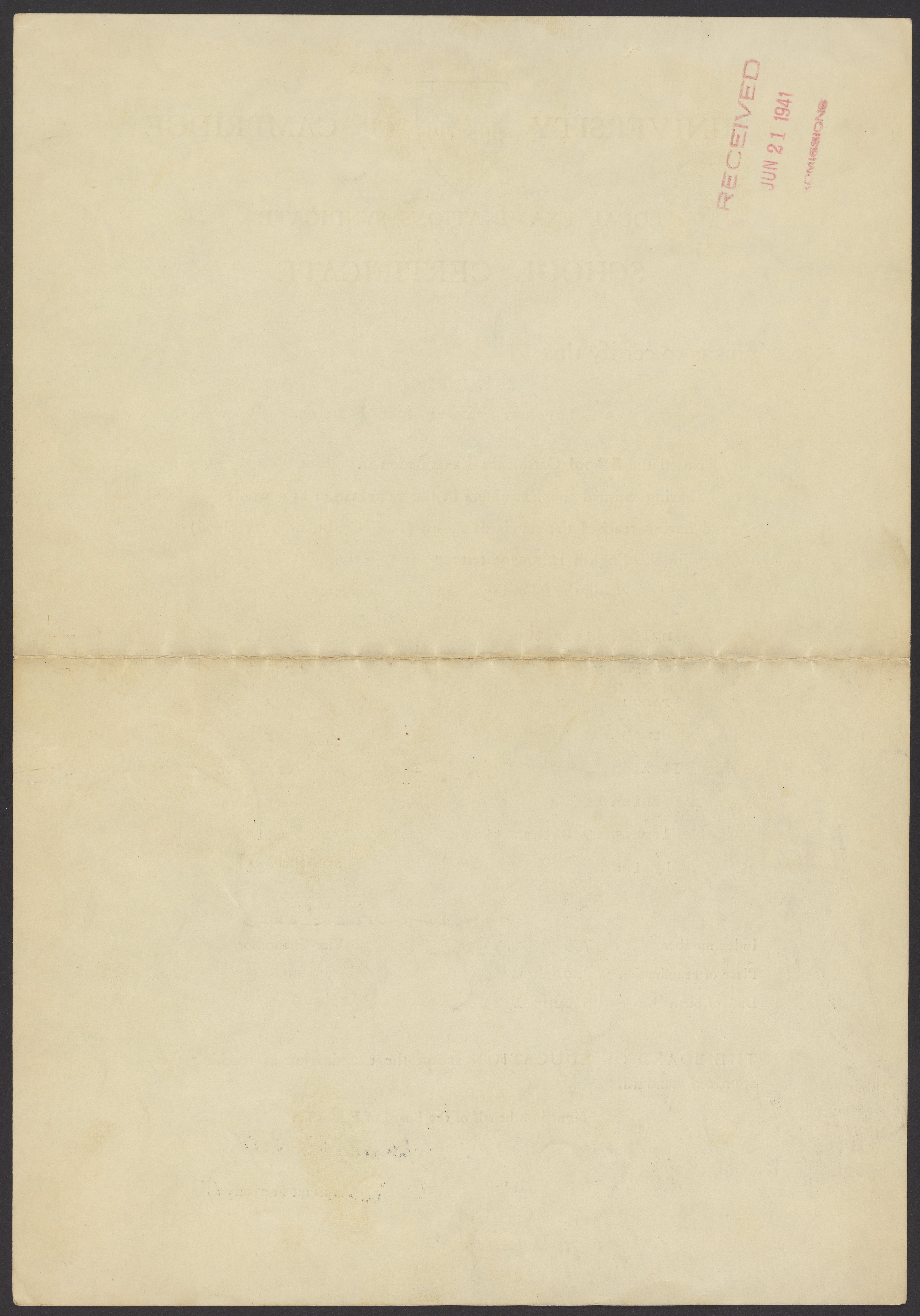 Certificate from the University of Cambridge Local Examinations Syndicate (UCLES), also known as the Cambridge Assessment, certifying that Kurt M. Mislow (1923-2017) of Shoreham Grammar School, Sussex, passed his school certificate exam in December 1939.
