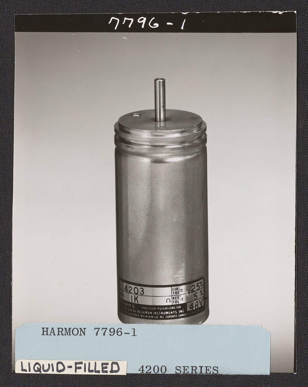 Harmon, Larry. “Helipot Liquid-Filled 4200 Series Potentiometer, Model 4203,” 1950–1969. Beckman Historical Collection, Box 86. Science History Institute. Philadelphia. https://digital.sciencehistory.org/works/mg74qm52z.