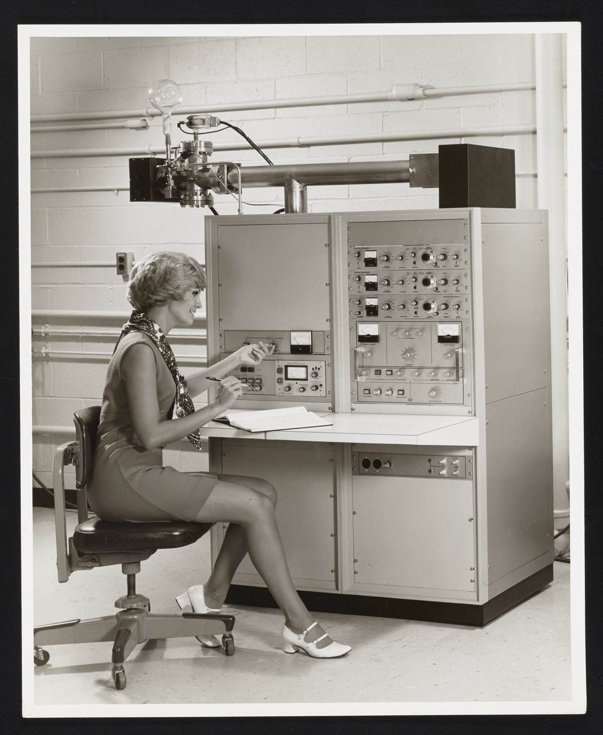 General view of a Bendix MA-2 Time-of-Flight Mass Spectrometer with a female model. The Time-of-Flight Mass Spectrometer (TOFMS) was the flagship analytical instrument of the Bendix Corporation.