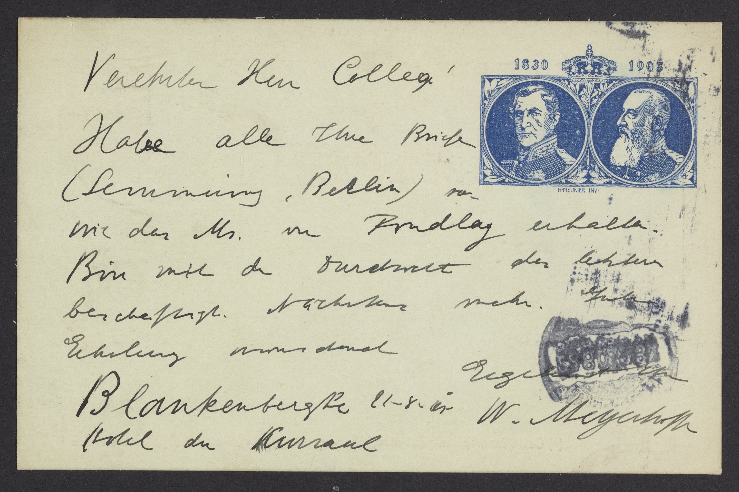 Meyerhoffer, Wihelm. “Postcard from Wilhelm Meyerhoffer to Georg Bredig, August 1905,” August 22, 1905. Papers of Georg and Max Bredig, Box 2, Folder 28. Science History Institute. Philadelphia. https://digital.sciencehistory.org/works/mh3kq7h.