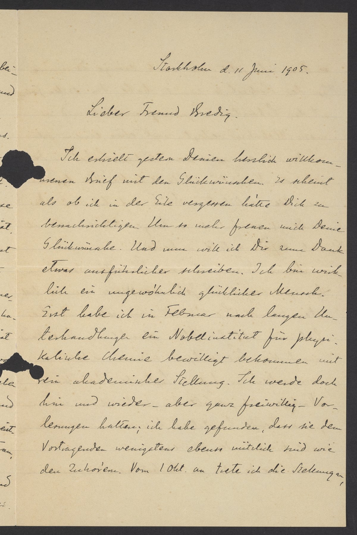 Ich erhielt gestern Deinen herzlich willkommenen Brief mit den Glückwünschen. Es scheint als ob ich in der Eile vergessen hatte Dich zu benachrichtigen. Um so mehr freuen mich Deine Glückwünsche. Und nun will ich Dir zum Dank etwas ausführlicher schreiben. Ich bin wirklich ein ungewöhnlich glücklicher Mensch. Erst habe ich in Februar nach langen Unterhandlungen ein Nobelinstitut für physikalische Chemie bewilligt bekommen mit rein akademischer Stellung. Ich werde doch hin und wieder – aber ganz freiwillig – Vorlesungen halten; ich habe gefunden, dass sie den Vortragenden wenigstens ebenso nützlich sind wie den Zuhörern. Von 1 Okt an trete ich die Stellung an,