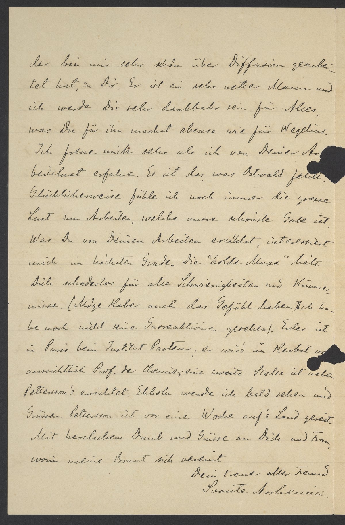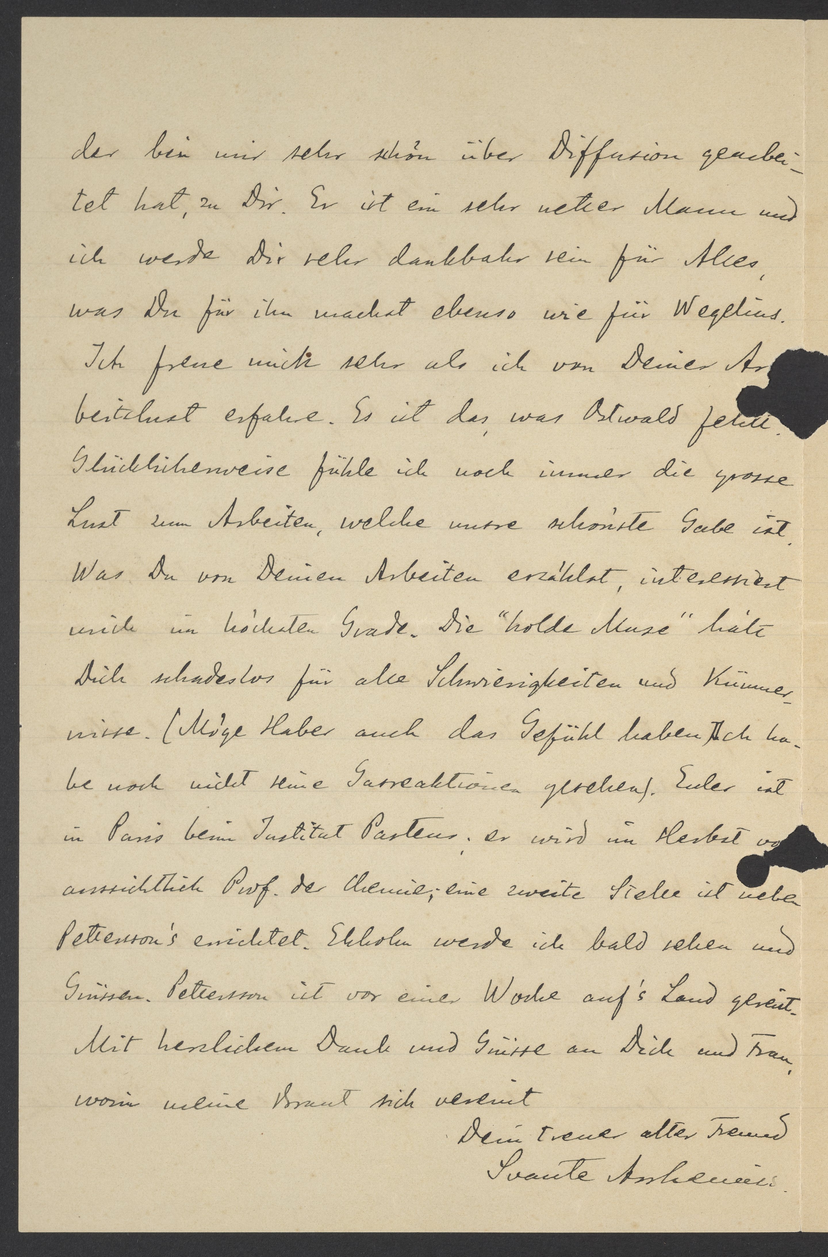Ich freue mich sehr als ich von Deiner Arbeitslust erfahre. Es ist das, was Ostwald fehlt. Glücklicherweise fühle ich noch immer die grosse Lust zum Arbeiten, welche unsere schönste Gabe ist. Was Du von Deinen Arbeiten erzählst, interessiert mich im höchsten Grade. Die "holde Muse" hält Dich schuldlos für alle Schwierigkeiten und Kümmernisse. (Möge Haber auch das Gefühl haben. Ich habe noch nicht seine Gasreaktionen gesehen). Euler ist in Paris beim Institut Pasteur; er wird im Herbst voraussichtlich Prof. der Chemie; eine zweite Stelle ist neben Pettersson’s errichtet. Ekholm werde ich bald sehen und grüssen. Pettersson ist vor einer Woche auf’s Land gereist.