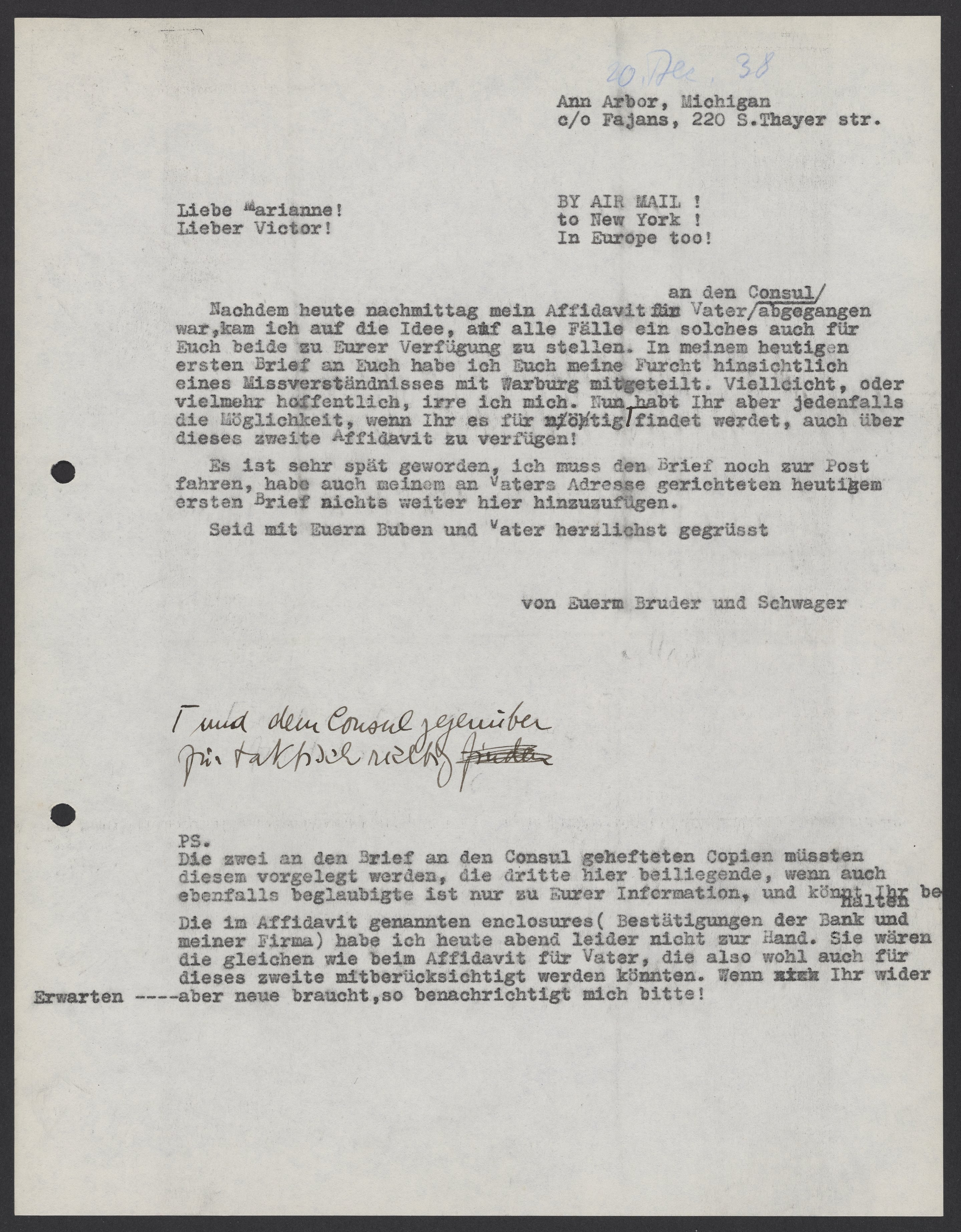 Nachdem heute nachmittag mein Affidavit für Vater an den Consul abgegeben war, kam ich auf die Idee, auf alle Fälle ein solches für Euch beide zu Eurer Verfügung zu stellen. In meinem heutigen ersten Brief an Euch habe ich Euch meine Furcht hinsichtlich eine Missverständnisses mit Warburg mitgeteilt. Vielleicht, oder vielmehr hoffentlich, irre ich mich. Nun habt Ihr aber jedenfalls die Möglichkeit, wenn Ihr es für nötig [und dem Consul gegenüber für taktisch richtig] findet werdet, auch über diese zweite Affidavit zu verfügen.