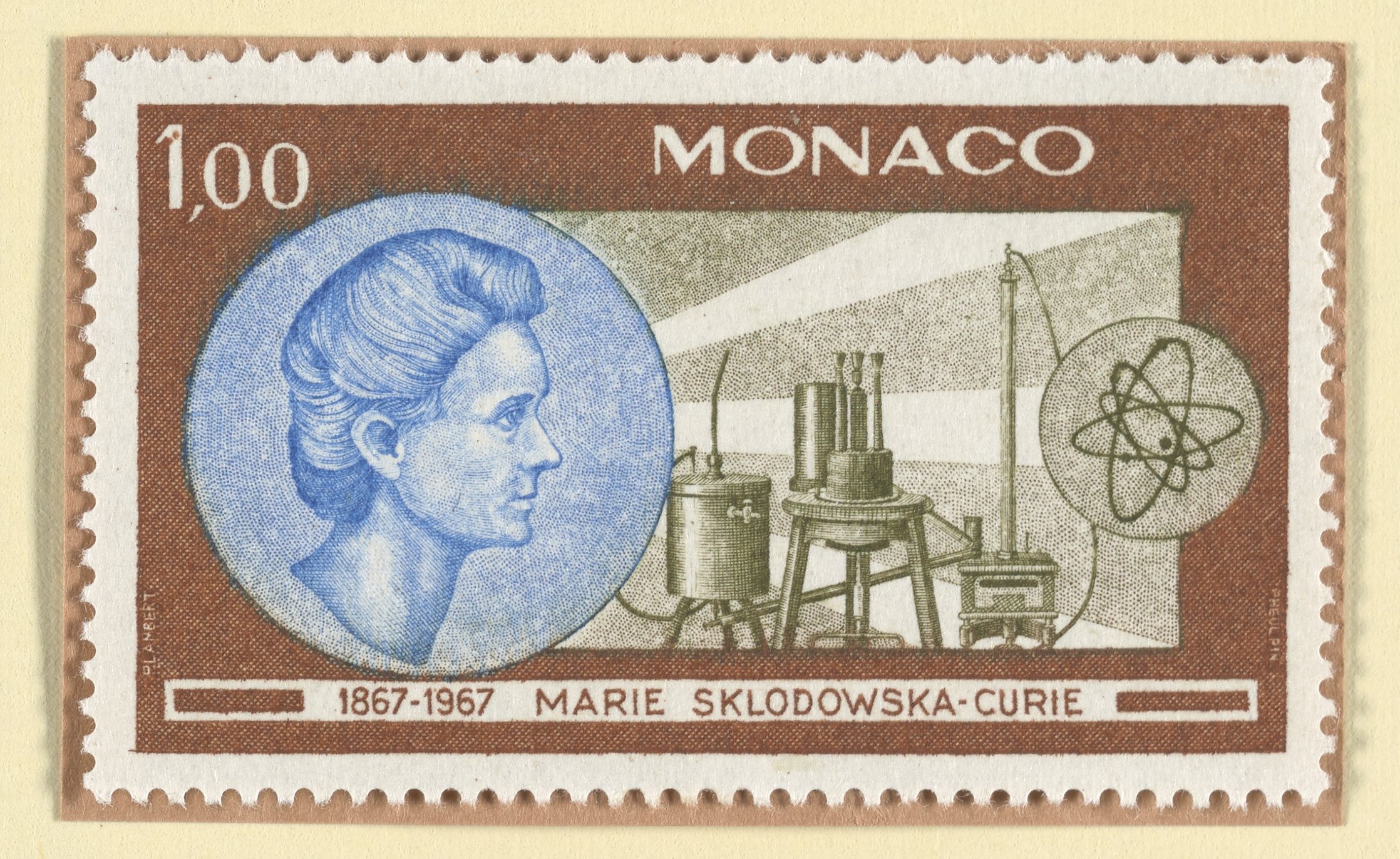 Lambert, Perrette. “Postage Stamp from Monaco Commemorating the 100th Anniversary of the Birth of Marie Curie.” Monaco, 1967. Witco Stamp Collection, Box 2. Science History Institute. Philadelphia. https://digital.sciencehistory.org/works/mk61rg99w.
