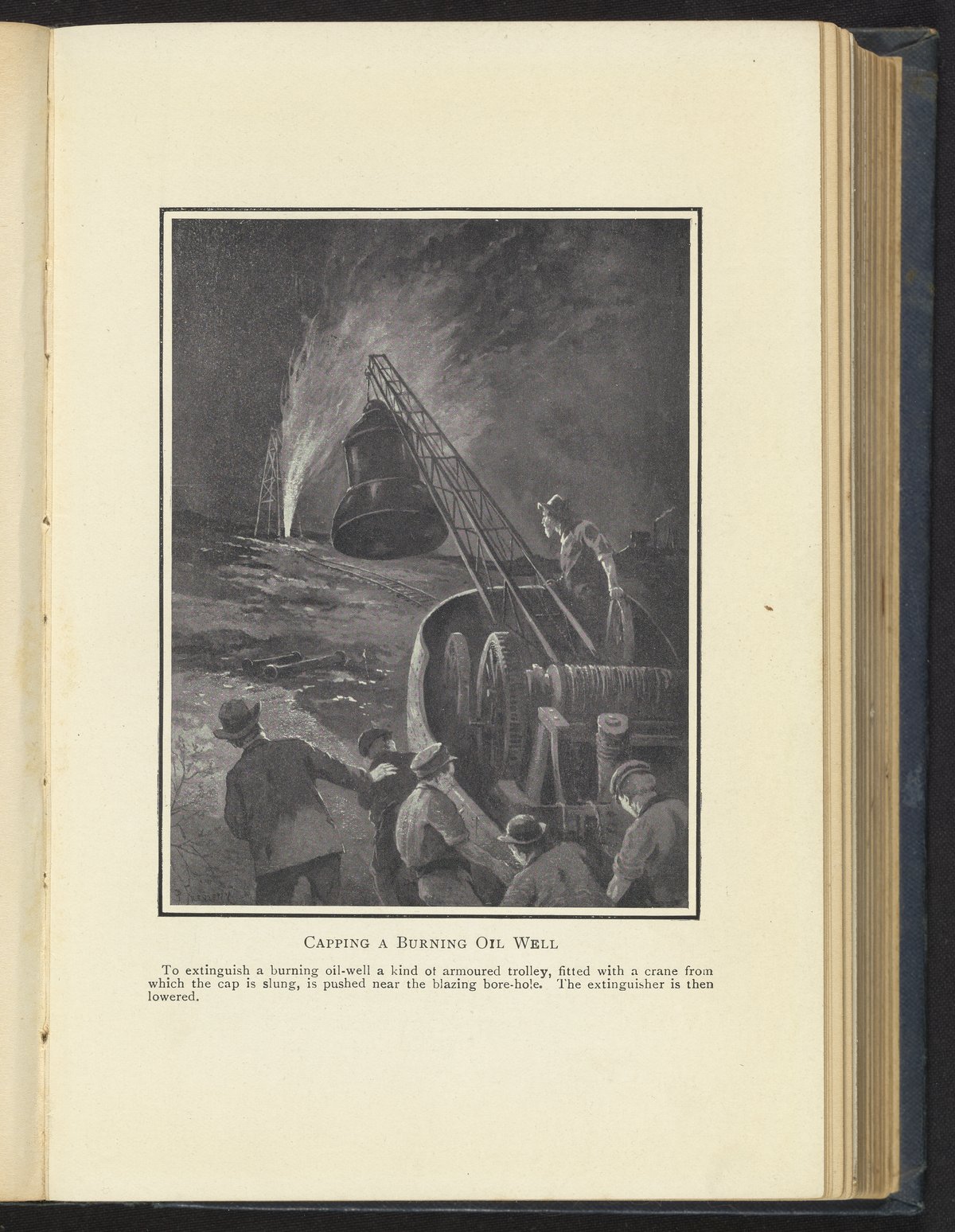 Philip, James Charles. “Workers Cap a Burning Oil Well.” The Romance of Modern Chemistry. London, England, 1909. https://digital.sciencehistory.org/works/mk61rj23z.