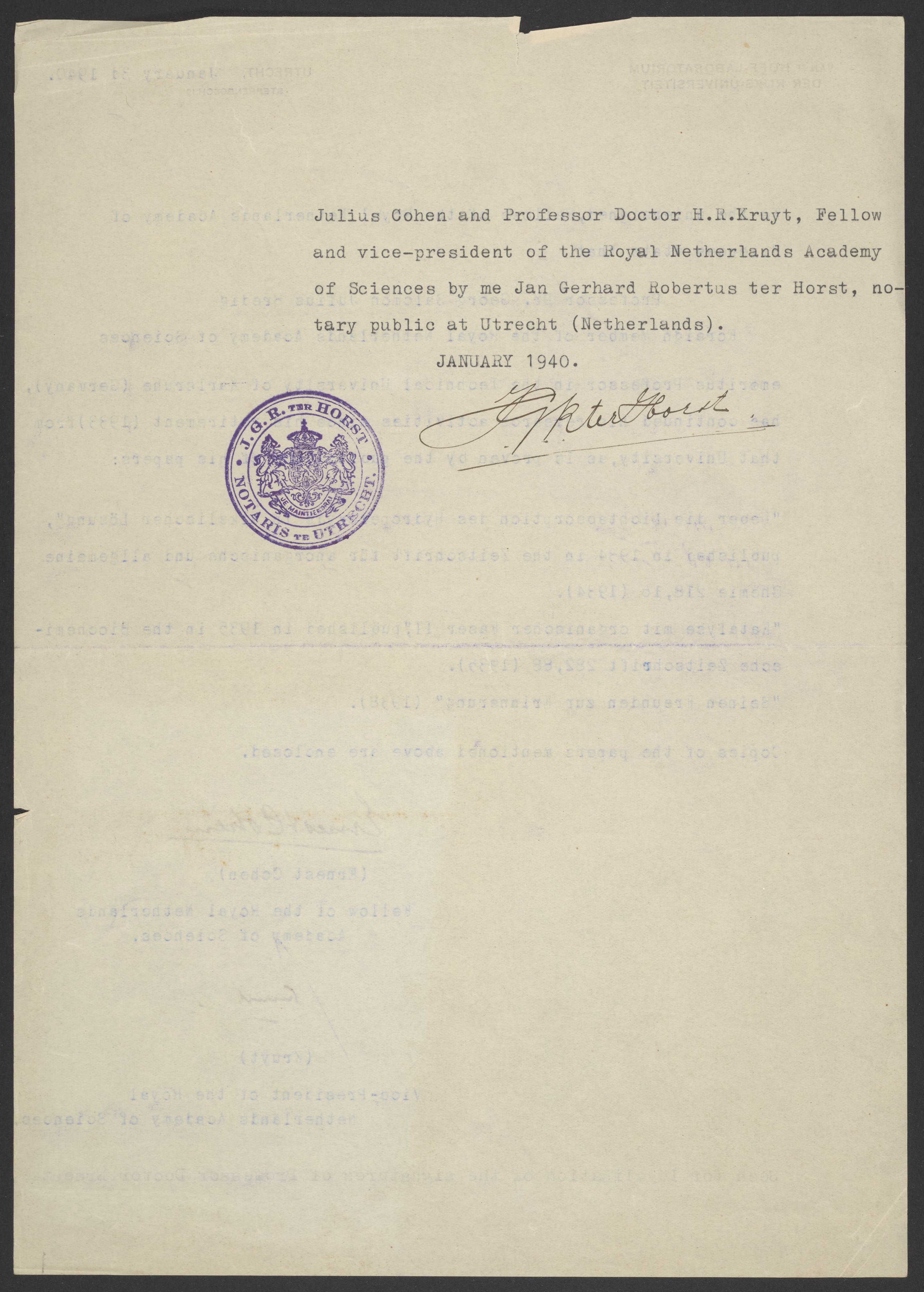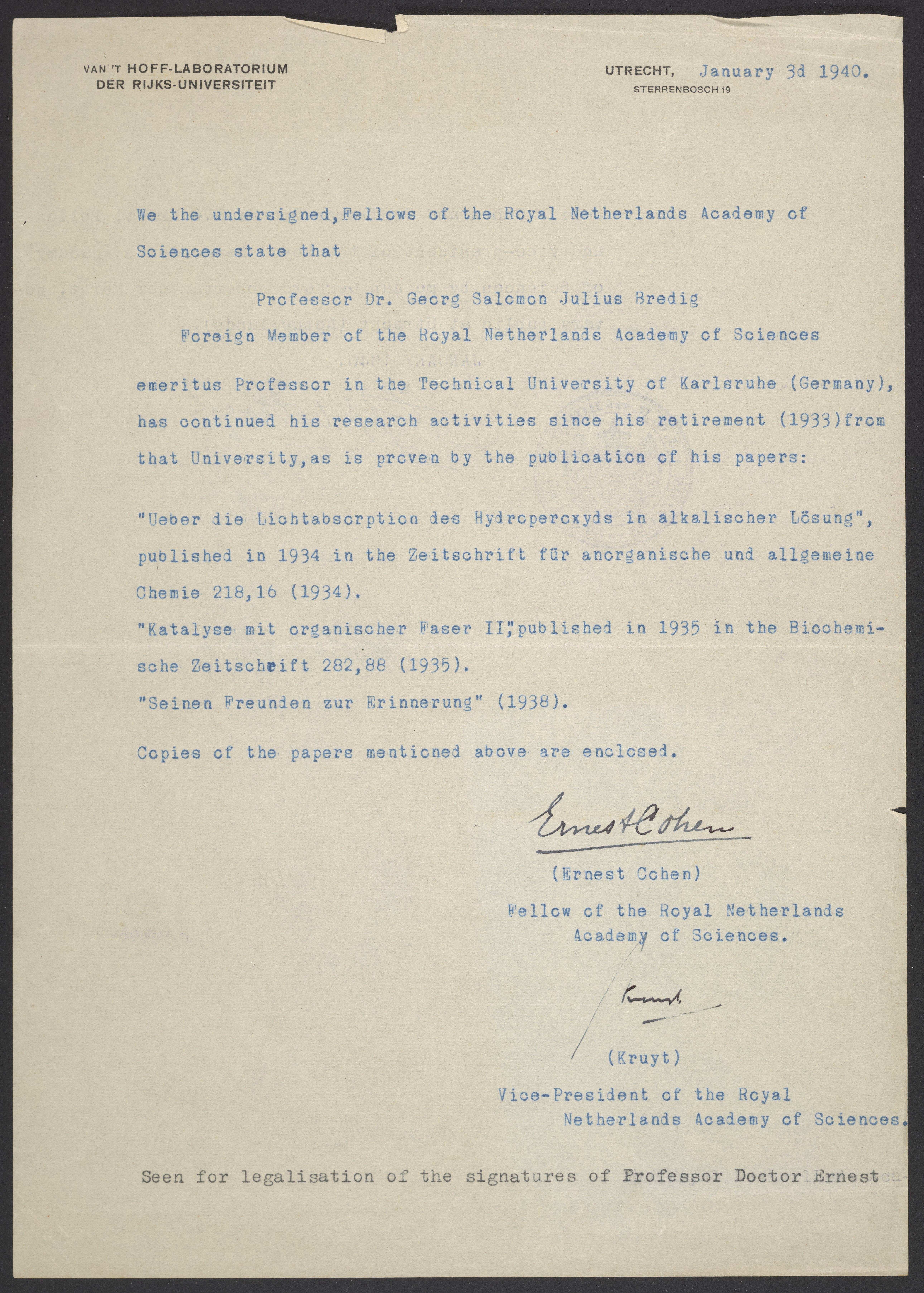 Statement from the Fellows of the Royal Netherlands Academy of Sciences regarding Georg Bredig's research activities from 1933-1940
