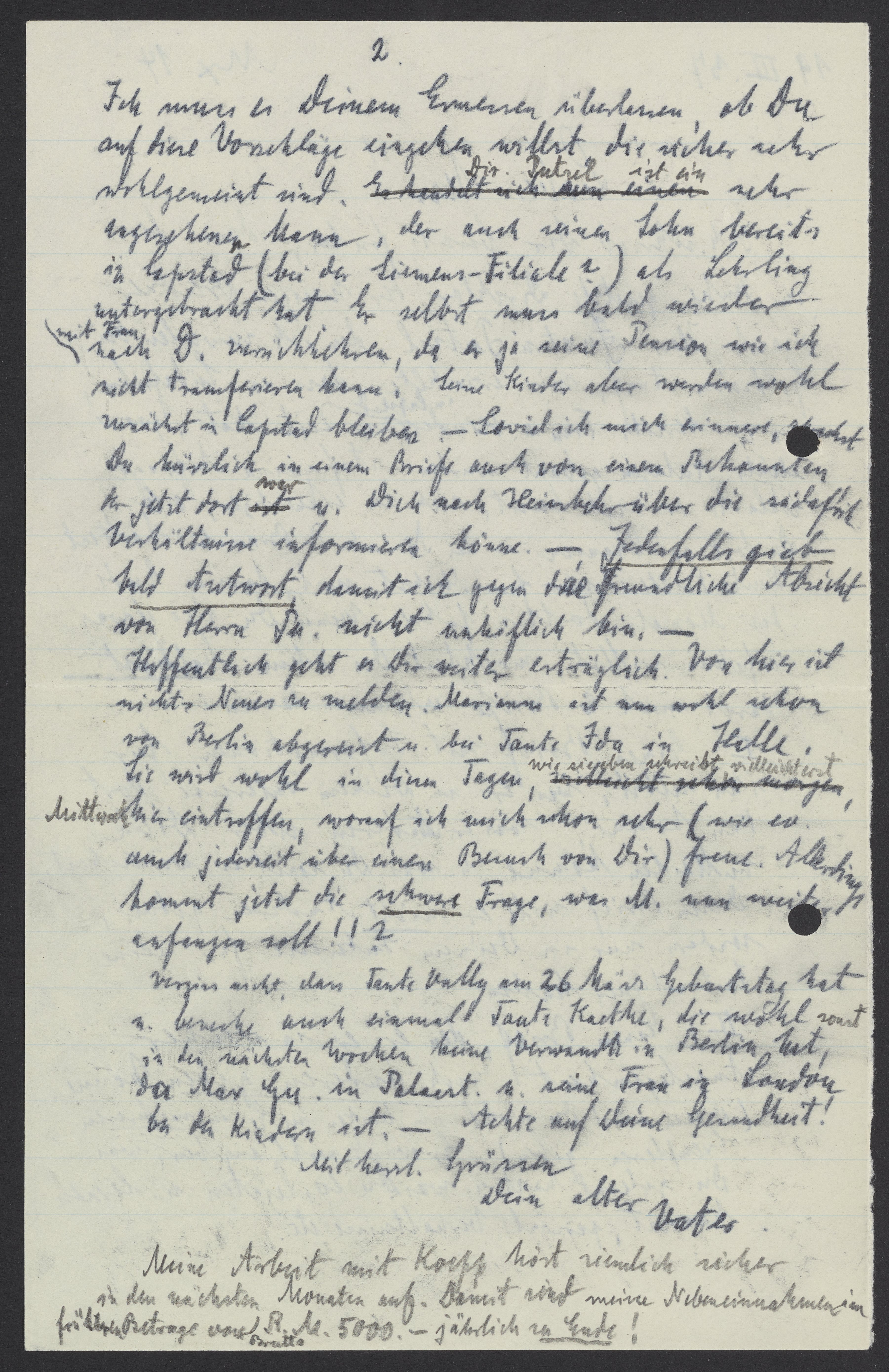 Vergiss nicht, dass Tante Vally am 26 März Geburtstag hat u. besuche auch einmal Tante Kaethe, die wohl sonst in den nächsten Wochen keine Verwandte in Berlin hat, da Max Gu. in Palaest. u. seine Frau in London bei den Kindern ist. – Achte auf Deine Gesundheit!