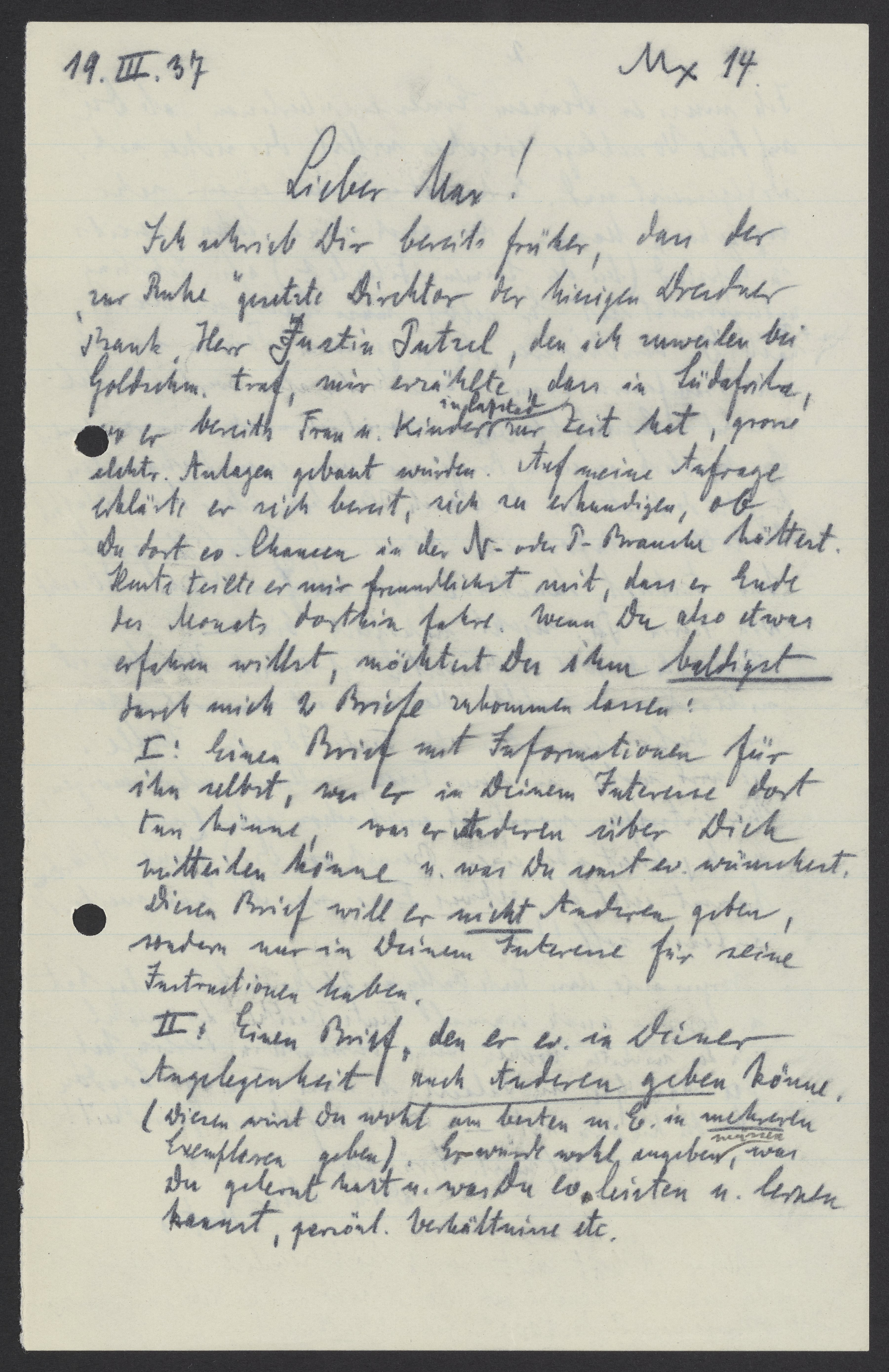 II: Einen Brief, den er ev. in Deiner Angelegenheit auch Anderen geben könne. (Diesen wirst Du wohl am besten m.E. in mehreren Exemplaren geben). Er würde wohl angeben, was Du gelernt hast u. was Du ev. leisten u. lernen kannst, persönl. Verhältnisse etc.