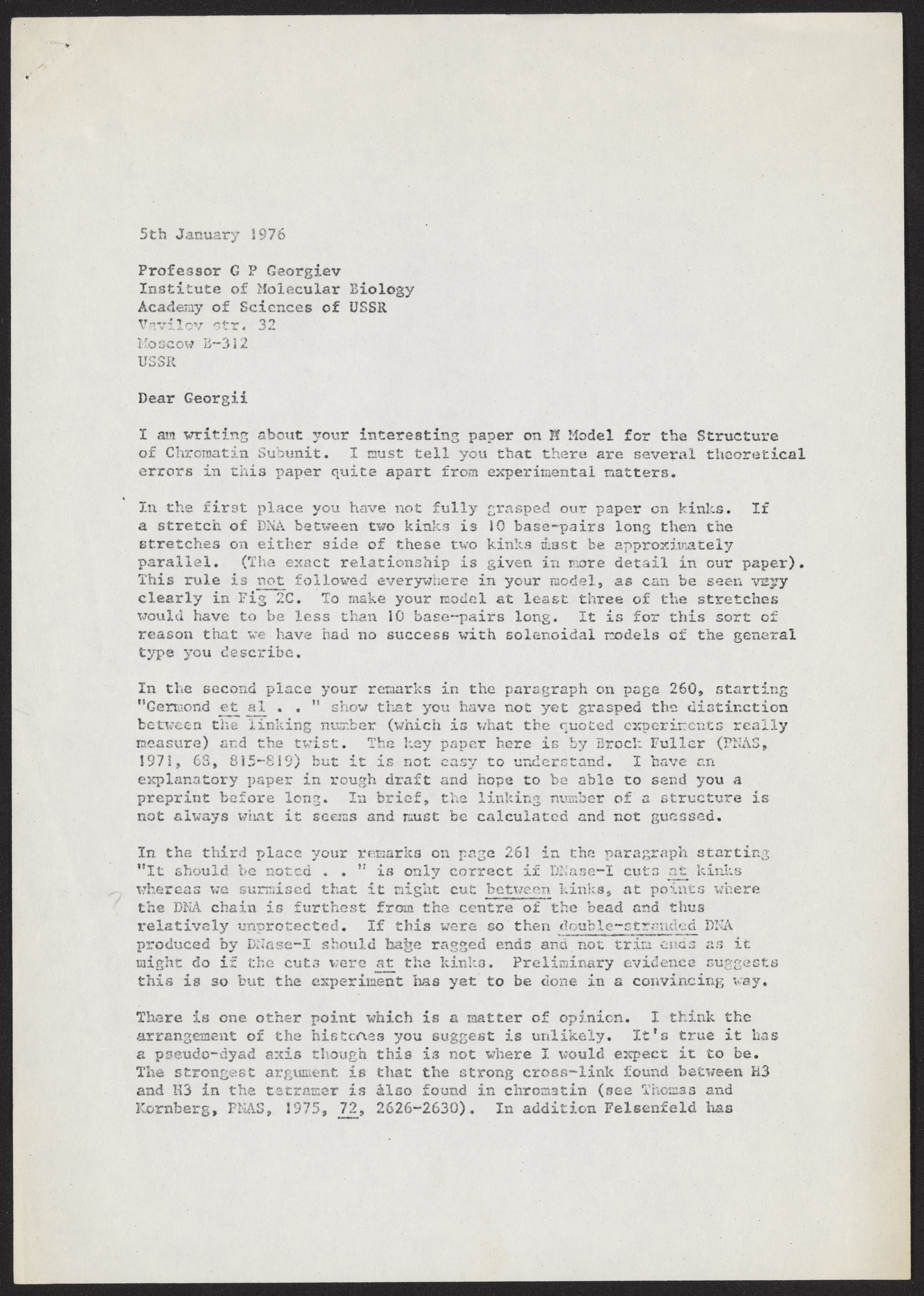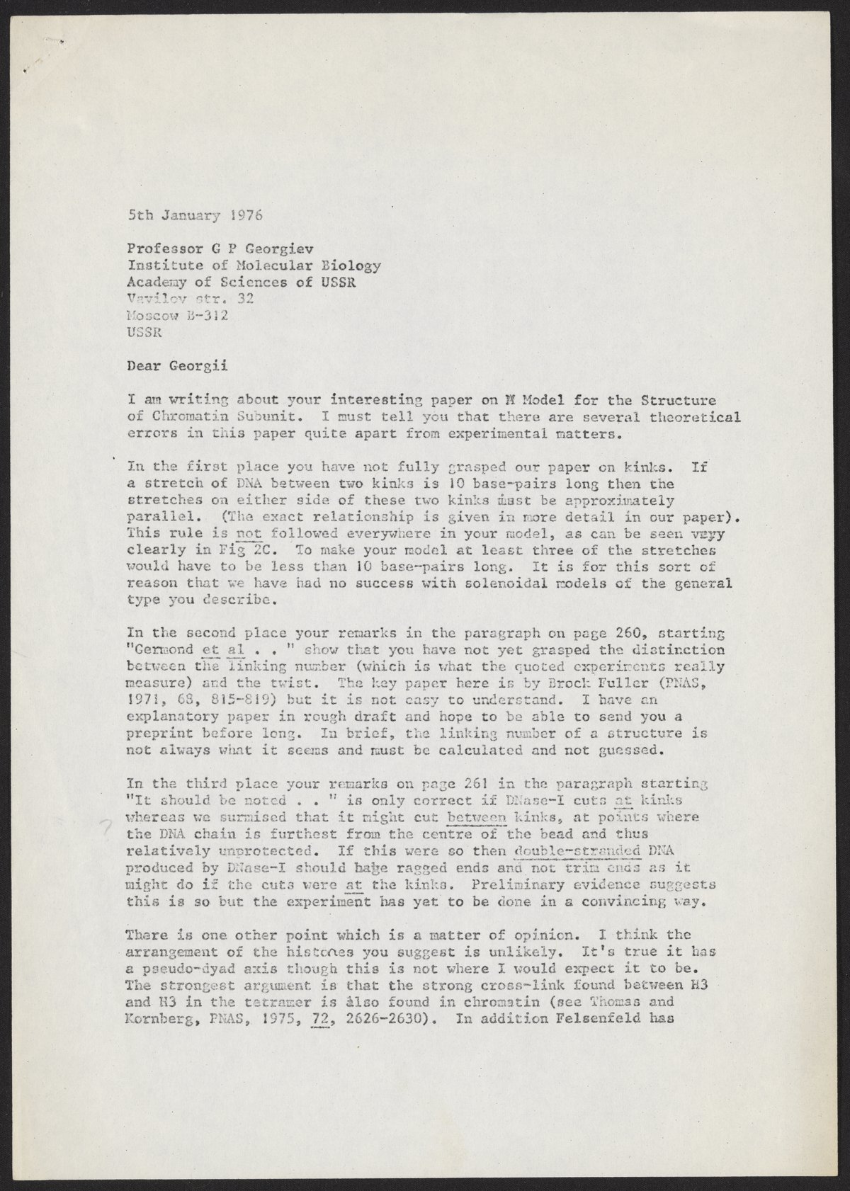 Letter from Francis Crick to Georgii Georgiev, January 5, 1976