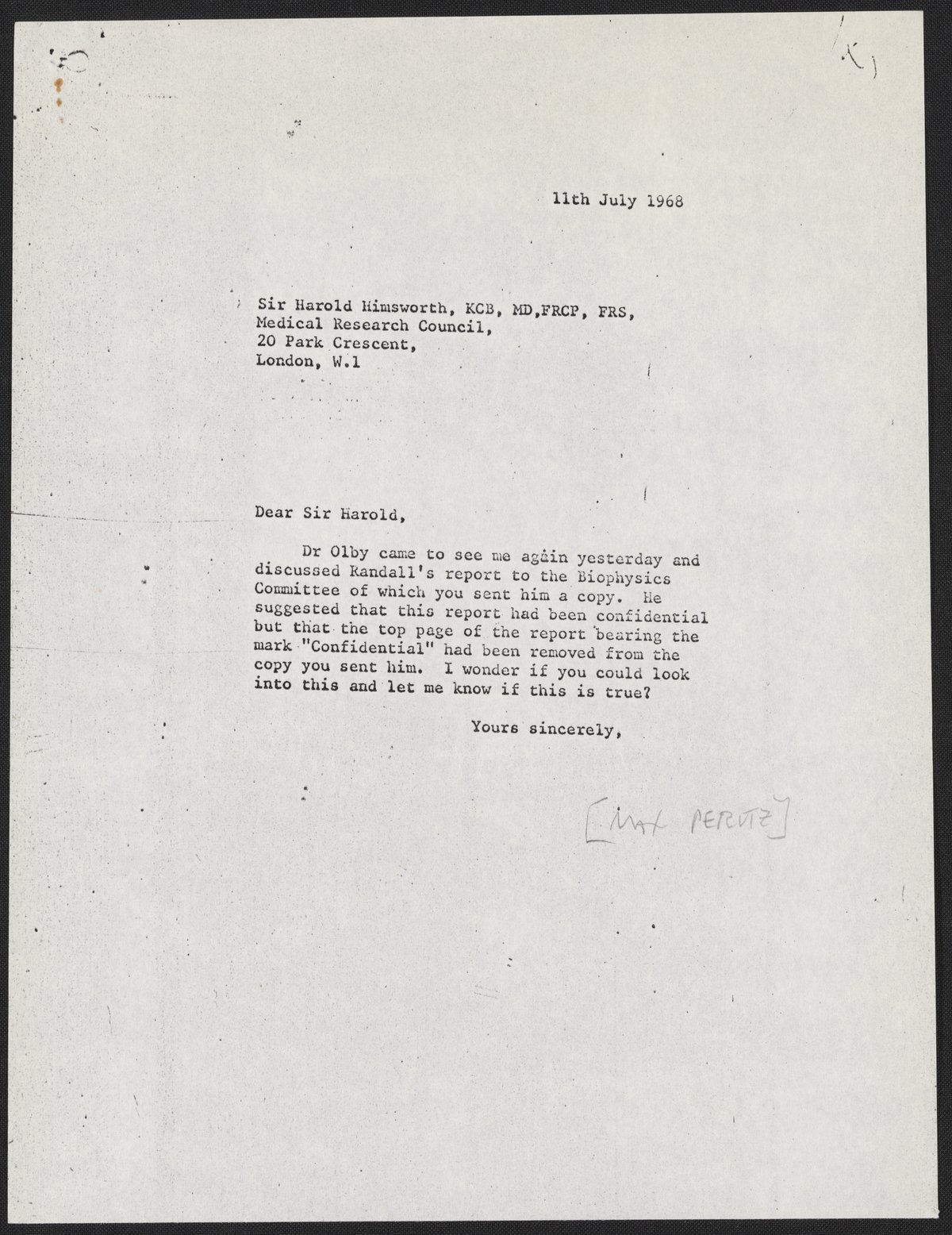 Letter from Max Perutz to Sir Harold Himsworth, July 11, 1968