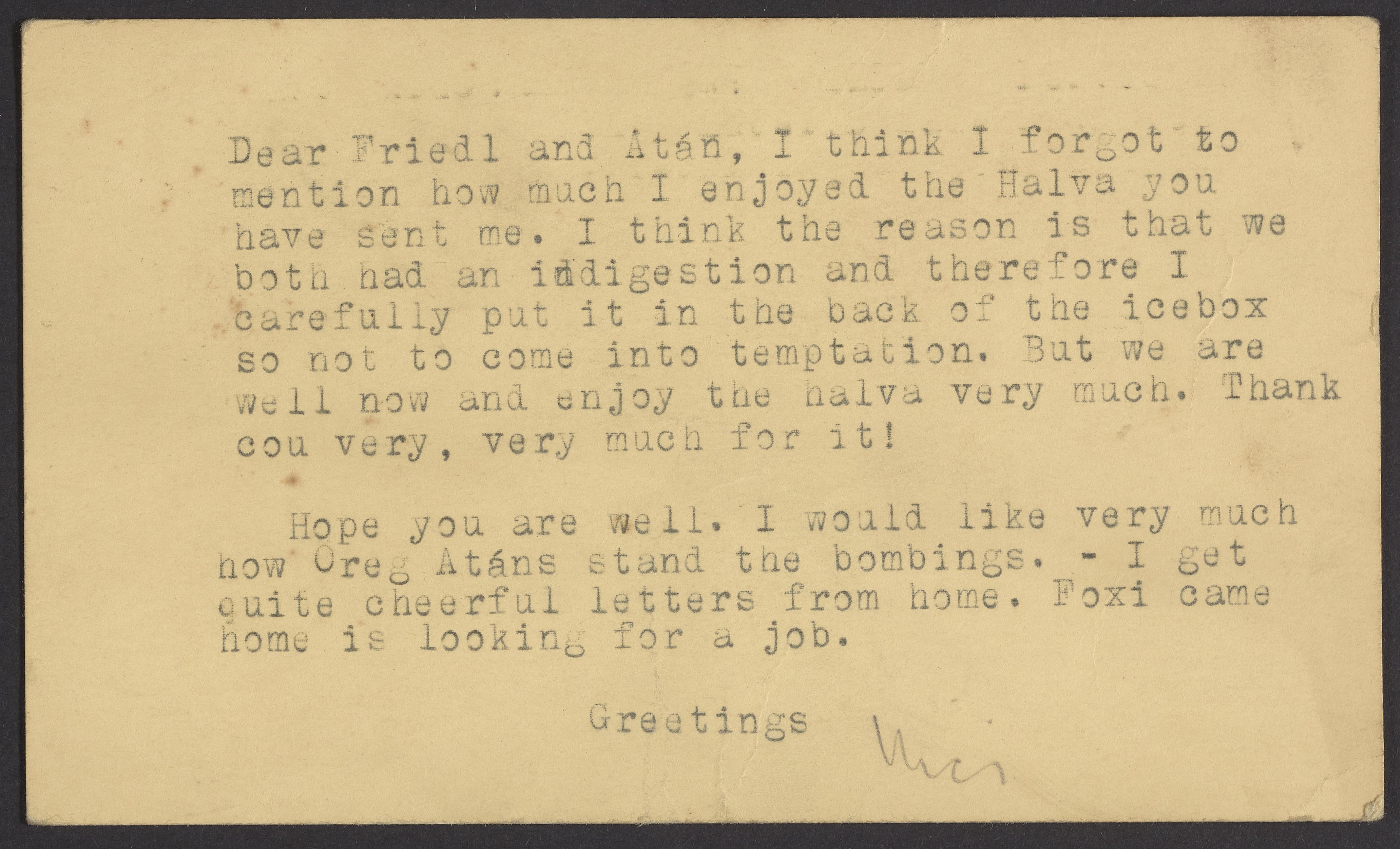Letter to Friedl and Gabor B. Levy from Mici Teller, January 17, 1941