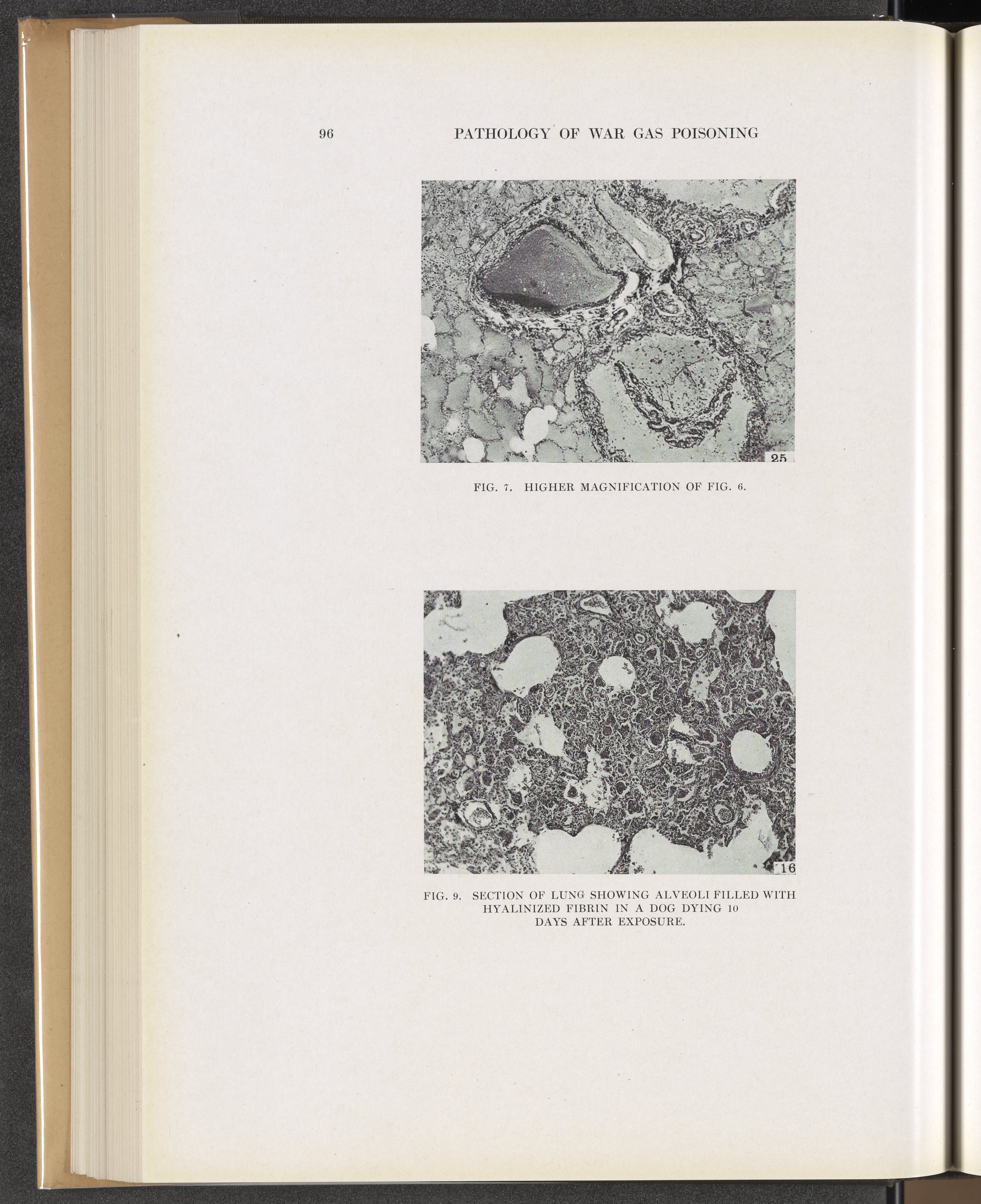 Winternitz, M. C. (Milton C.). “Fig. 7: Higher Magnification of Fig. 6. Fig. 9: Section of Lung Showing Alveoli Filled with Hyalinized Fibrin in a Dog Dying 10 Days after Exposure.” Collected Studies on the Pathology of War Gas Poisoning. New Haven, Connecticut: Yale University Press, 1920. https://digital.sciencehistory.org/works/ms35t876b.