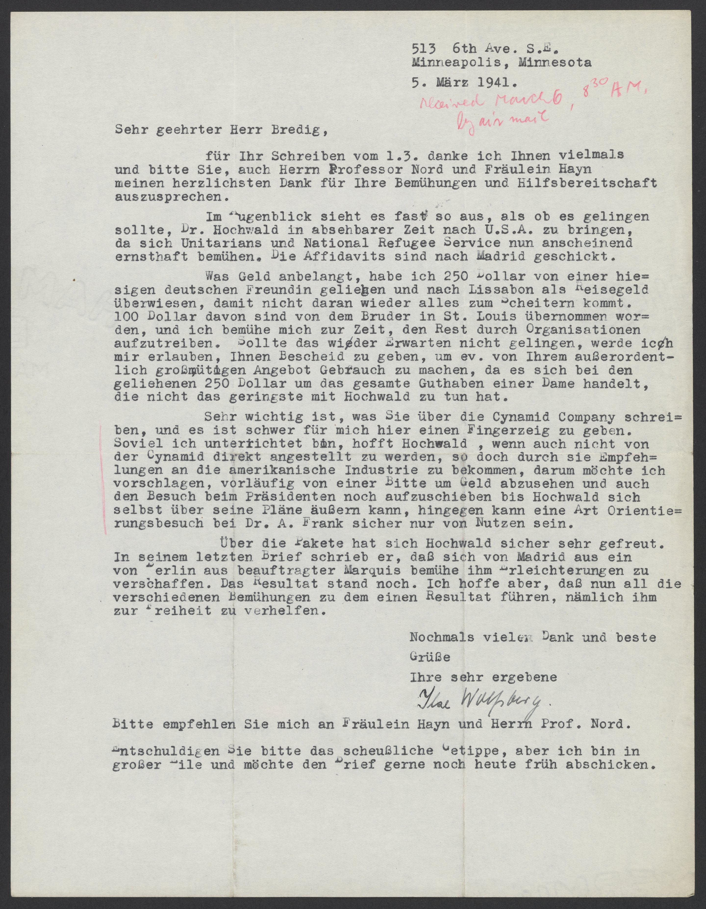 Was Geld anbelangt, habe ich 250 Dollar von einer hiesigen deutschen Freundin geliehen und nach Lissabon als Reisegeld überwiesen, damit nicht daran wieder alles zum Scheitern kommt. 100 Dollar davon sind von dem Bruder in St. Louis übernommen worden, und ich bemühe mich zur Zeit, den Rest durch Organisationen aufzutreiben. Sollt das wieder Erwarten nicht gelingen, werde ich mir erlauben, Ihnen Bescheid zu geben, um ev. von Ihrem außerordentlich großmütigen Angebot Gebrauch zu machen, da es sich bei den geliehenen 250 Dollar um das gesamte Guthaben einer Dame handelt, die nicht das geringst mit Hochwald zu tun hat.
