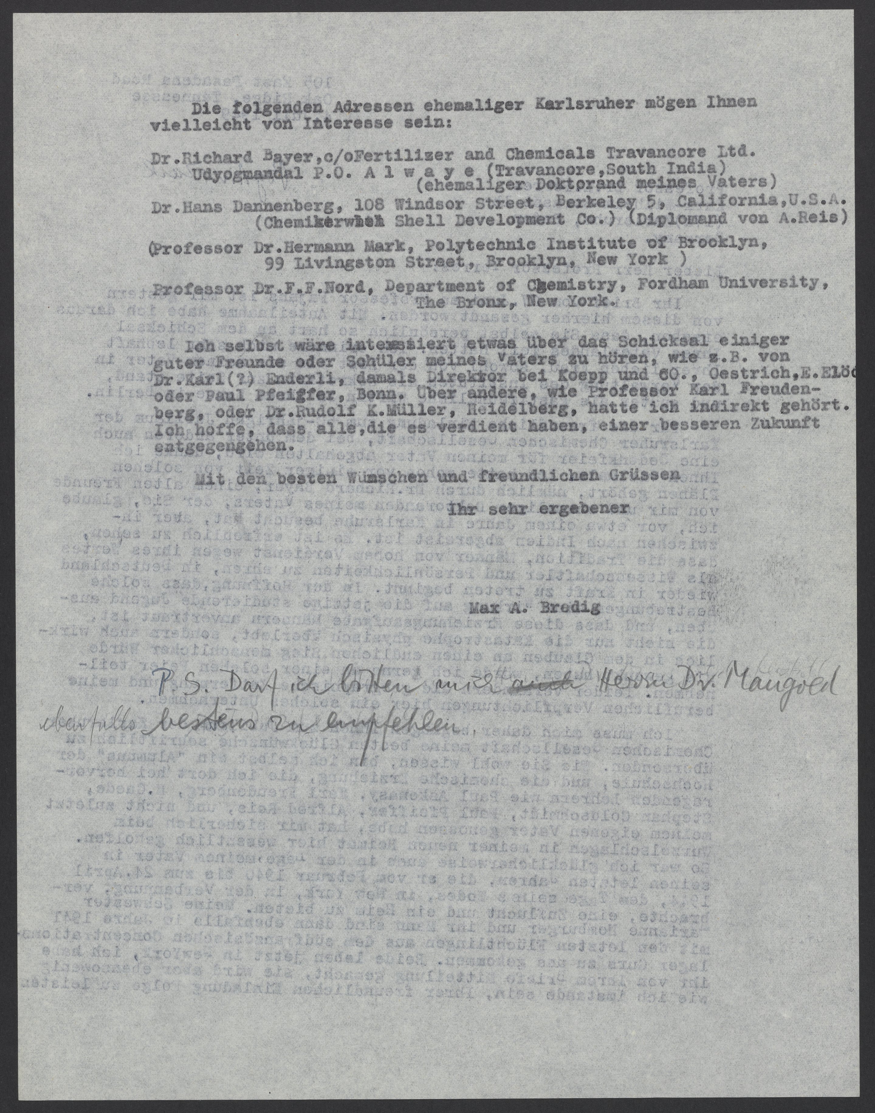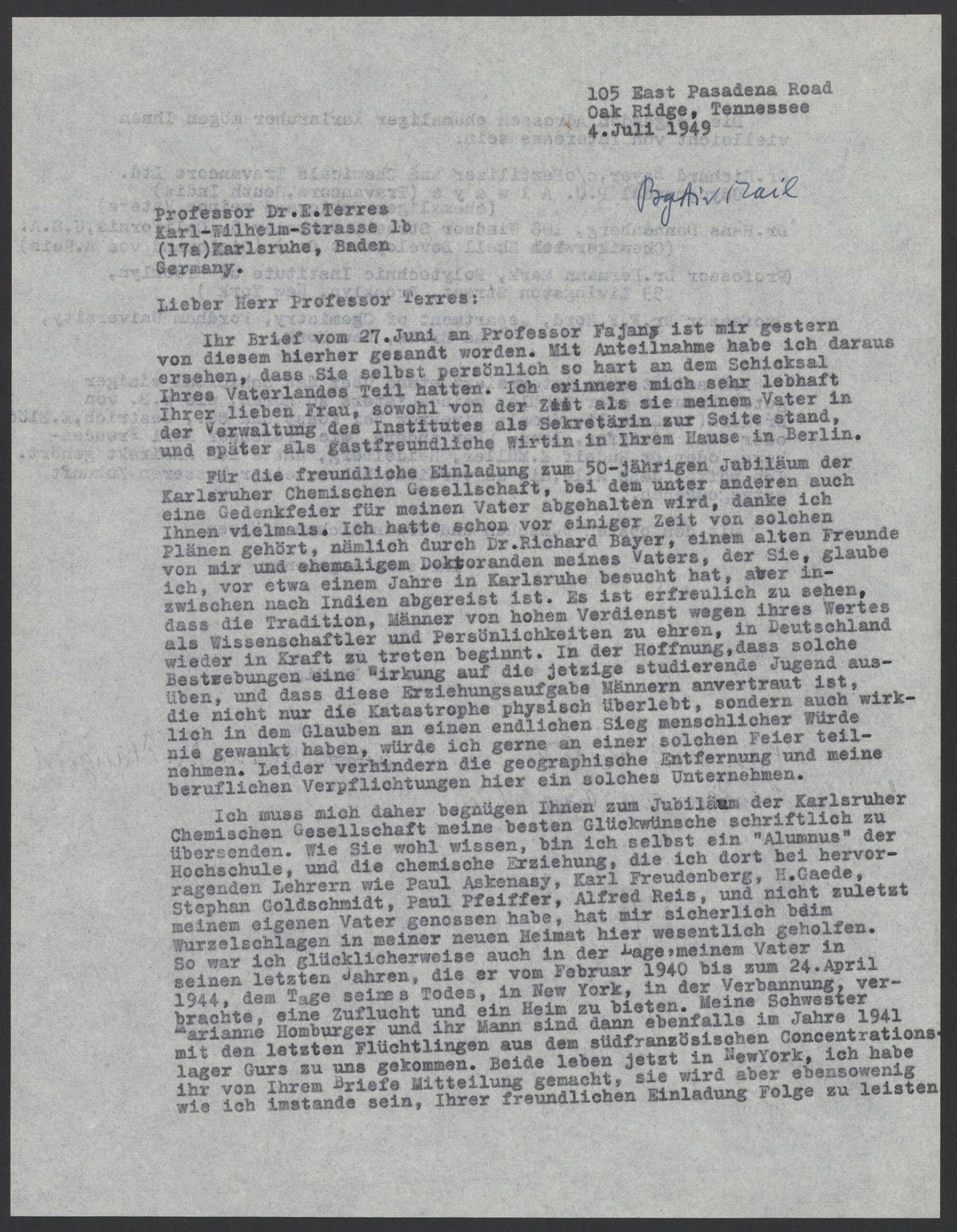 Letter from Max Bredig to Ernst Terres, July 4, 1949