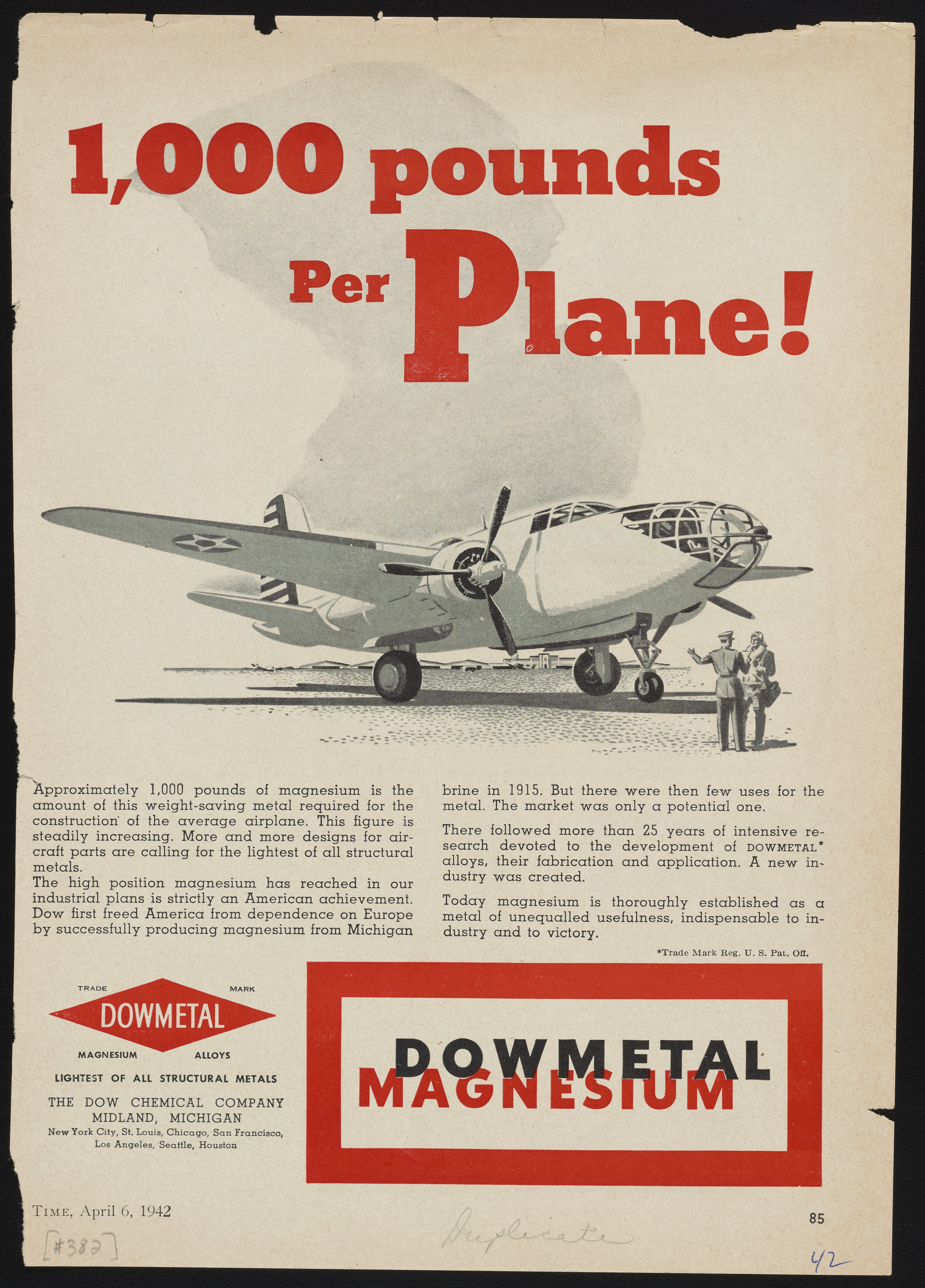 Dow Chemical Company. “1,000 Pounds Per Plane!,” June 4, 1942. Advertisements from the Dow Chemical Historical Collection, Box 8. Science History Institute. Philadelphia. https://digital.sciencehistory.org/works/mvmxo2w.