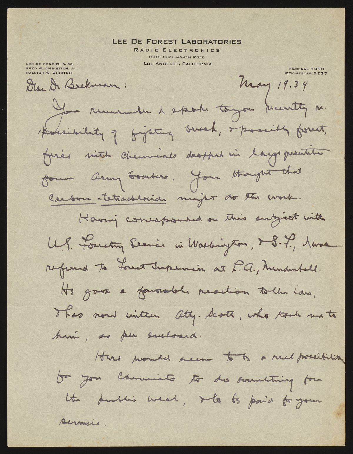 Forest, Lee De. “Letter from Lee De Forest to Arnold O. Beckman,” May 10, 1934. Beckman Historical Collection, Box 1, Folder 17. Science History Institute. Philadelphia. https://digital.sciencehistory.org/works/mw22v605t.