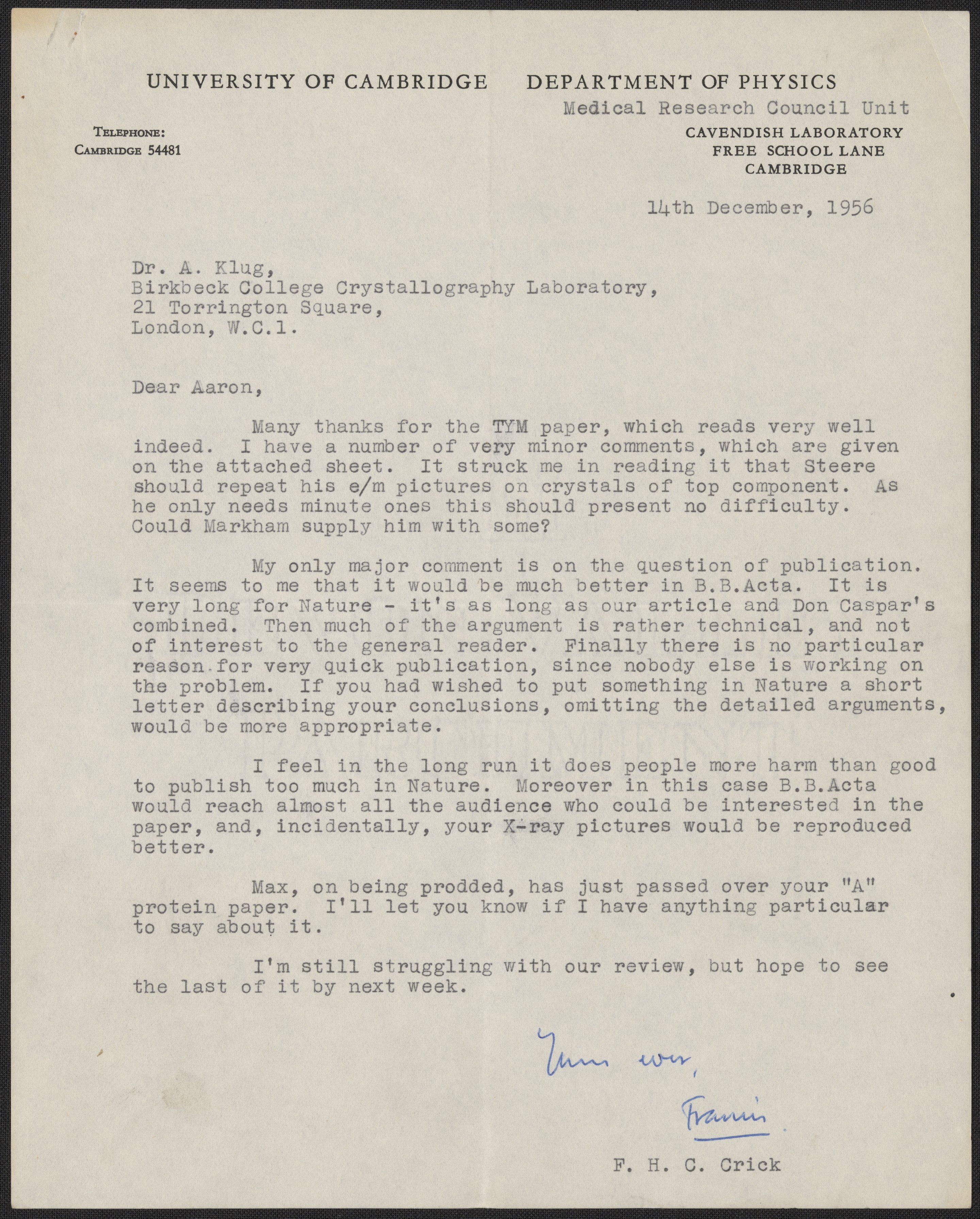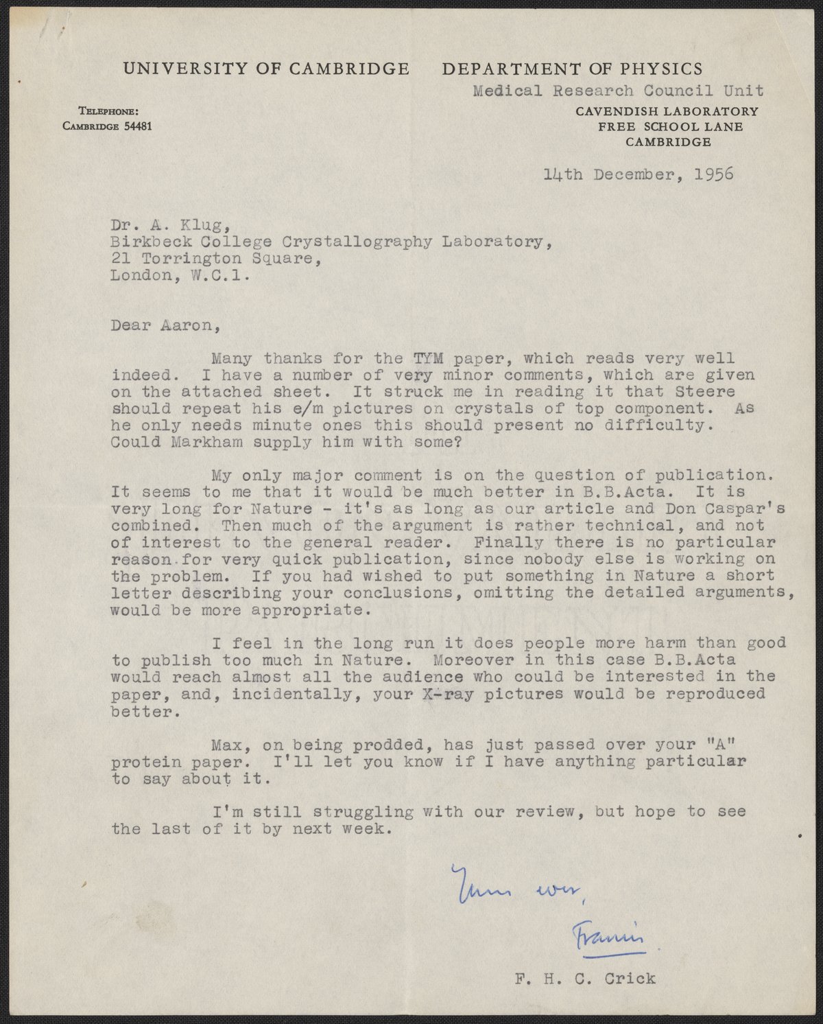 Letter from Francis Crick to Aaron Klug, December 14, 1956