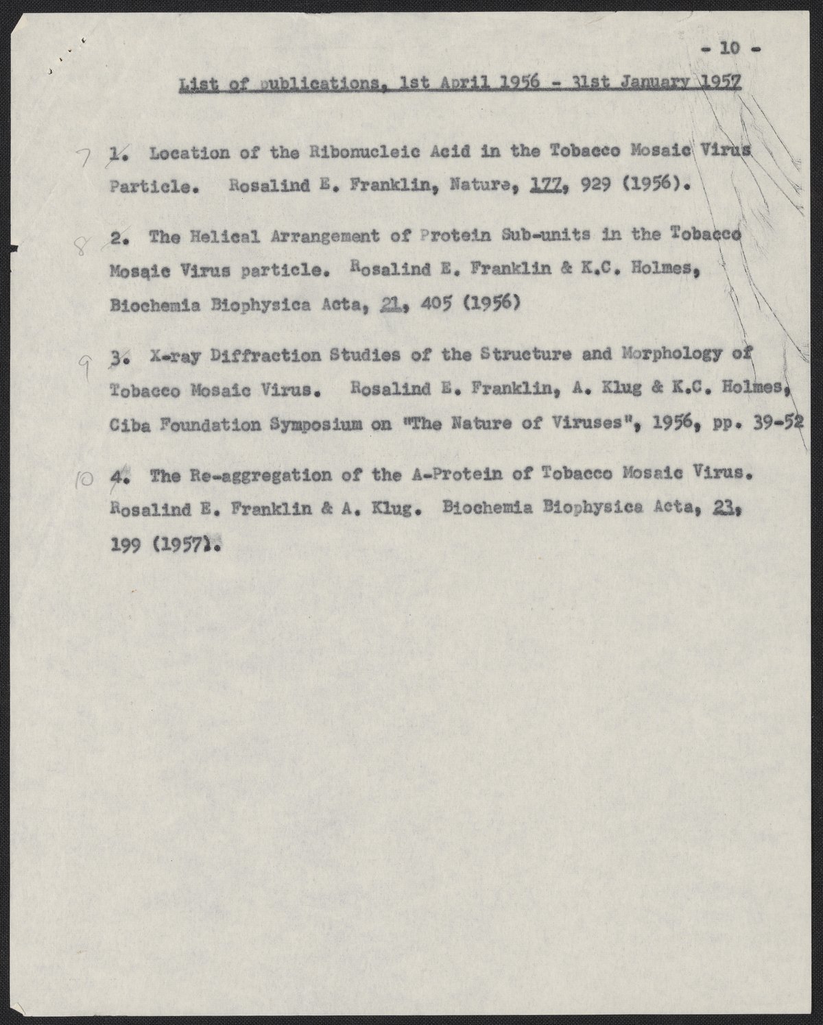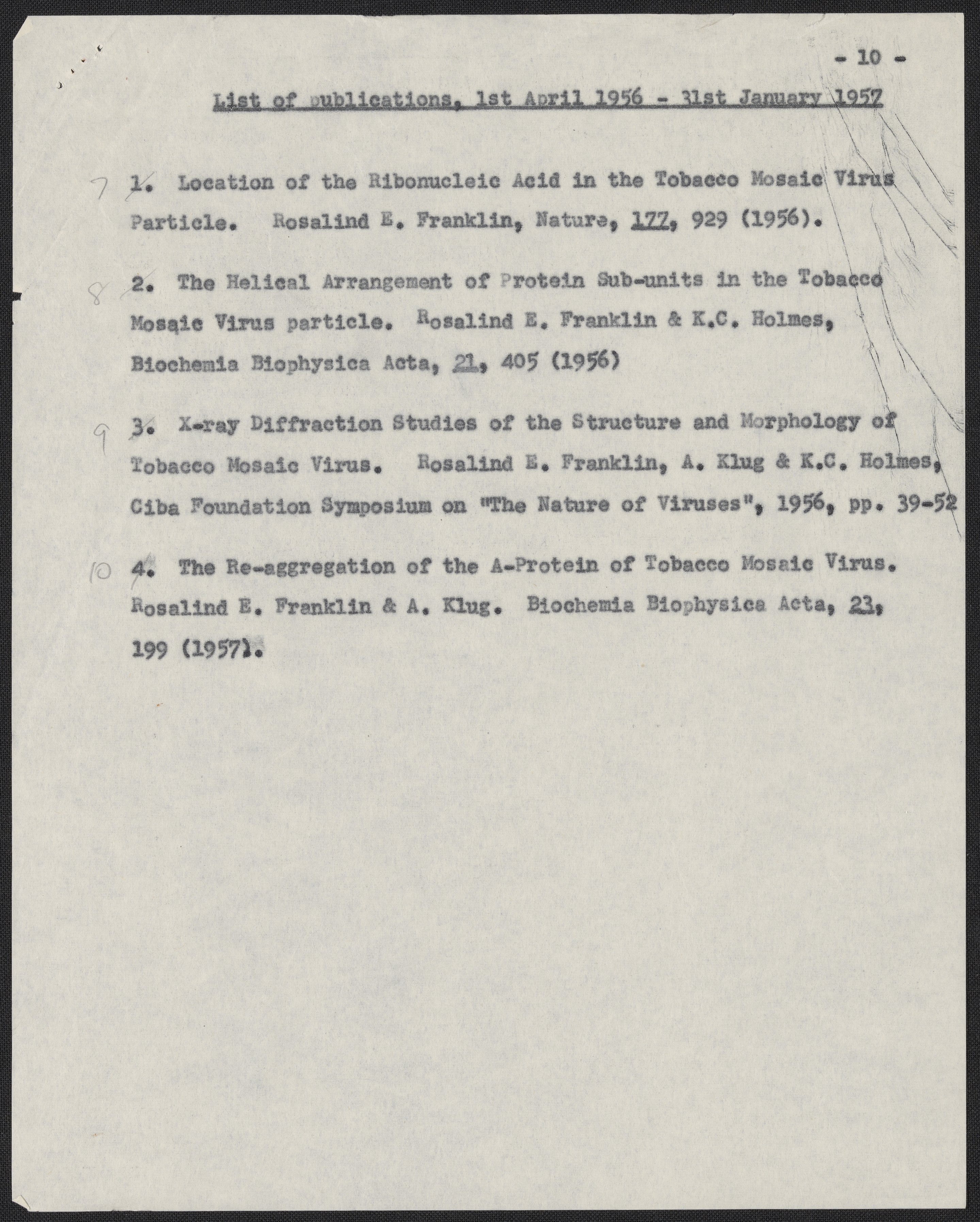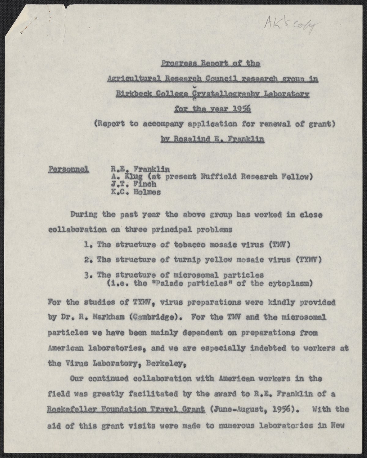 Franklin, Rosalind. “Progress Report of the Agricultural Research Council Research Group in Birkbeck College Crystallography Laboratory for the Year 1956,” 1956. History of Molecular Biology Collection, Box 10, Folder 11. Science History Institute. Philadelphia. https://digital.sciencehistory.org/works/mx4ubuu.