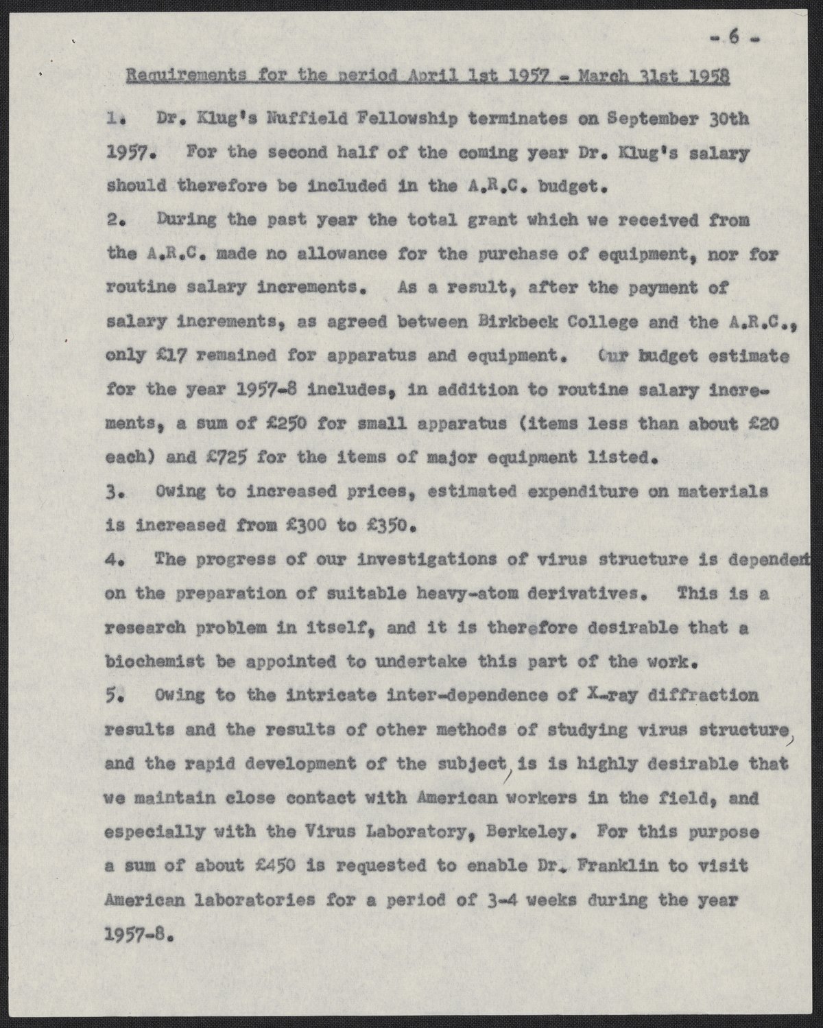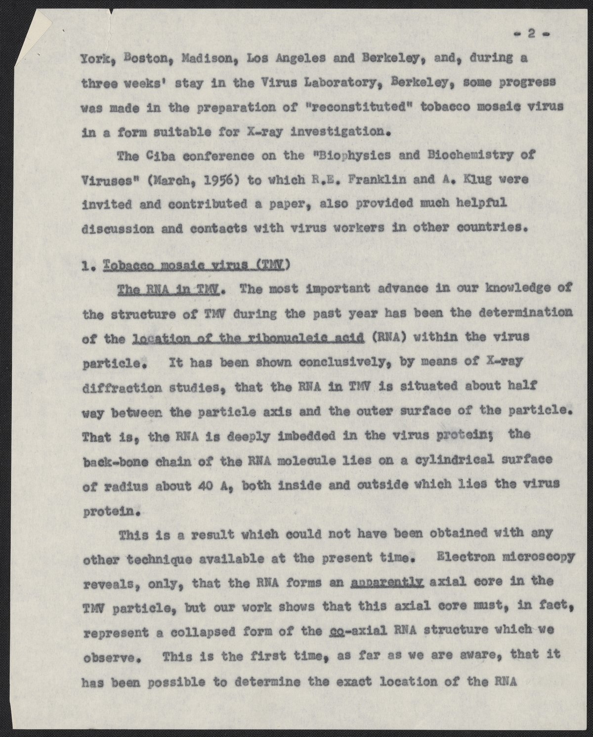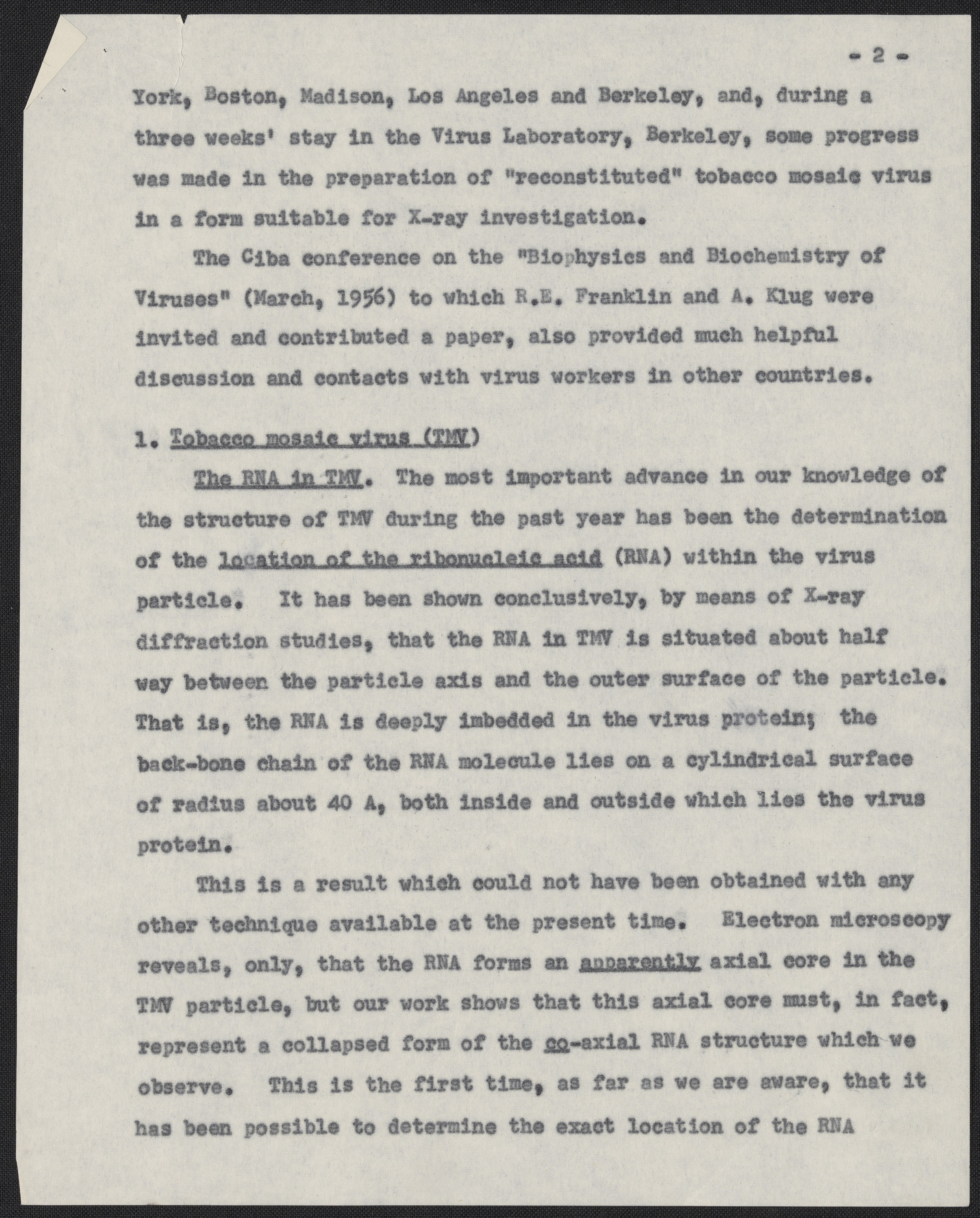 Franklin, Rosalind. “Progress Report of the Agricultural Research Council Research Group in Birkbeck College Crystallography Laboratory for the Year 1956,” 1956. History of Molecular Biology Collection, Box 10, Folder 11. Science History Institute. Philadelphia. https://digital.sciencehistory.org/works/mx4ubuu.