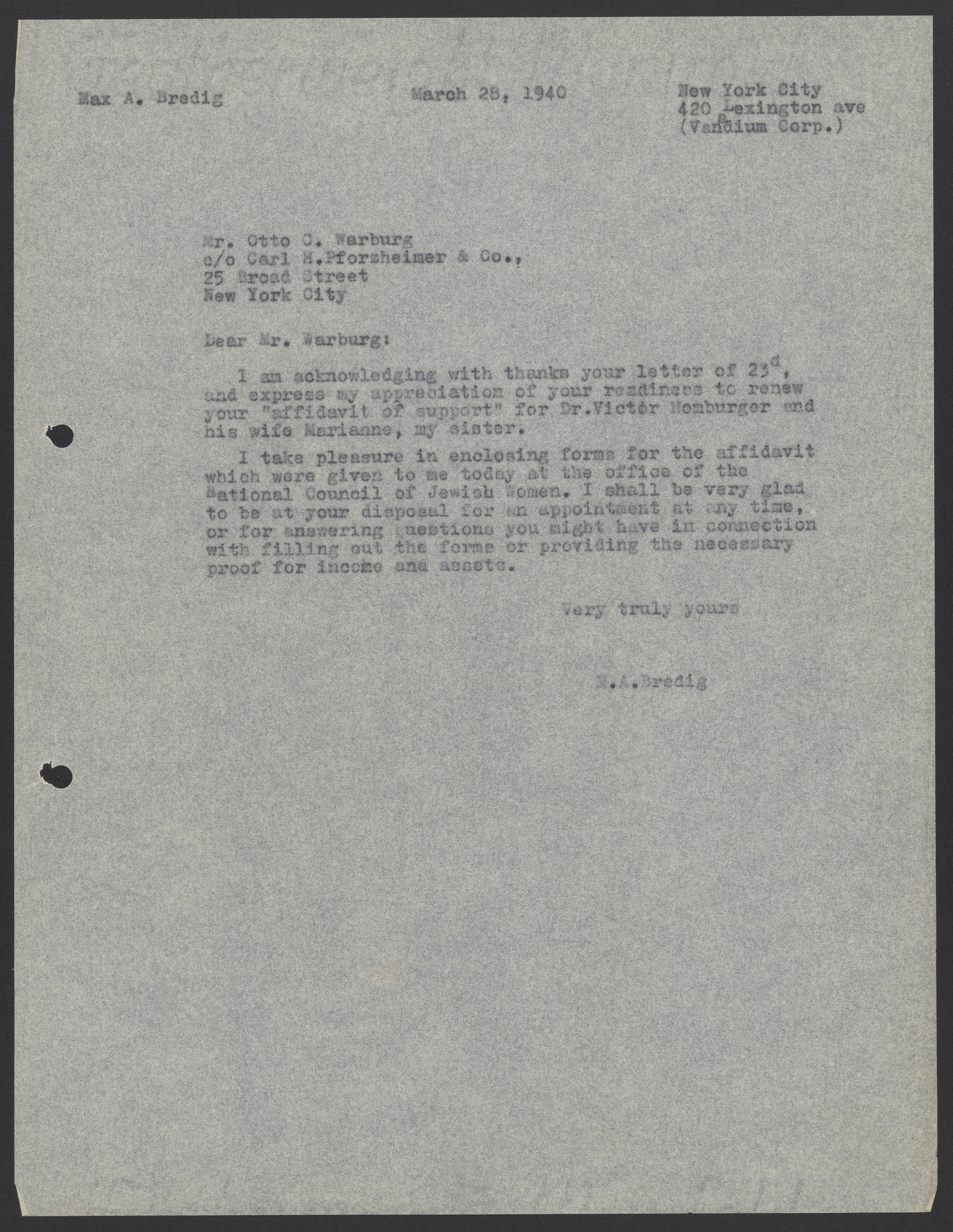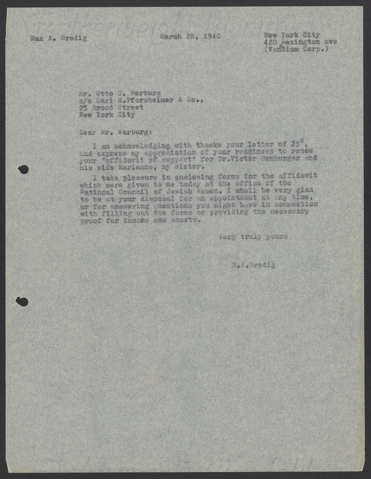 Letter from Max Bredig to Otto C. Warburg, March 28, 1940