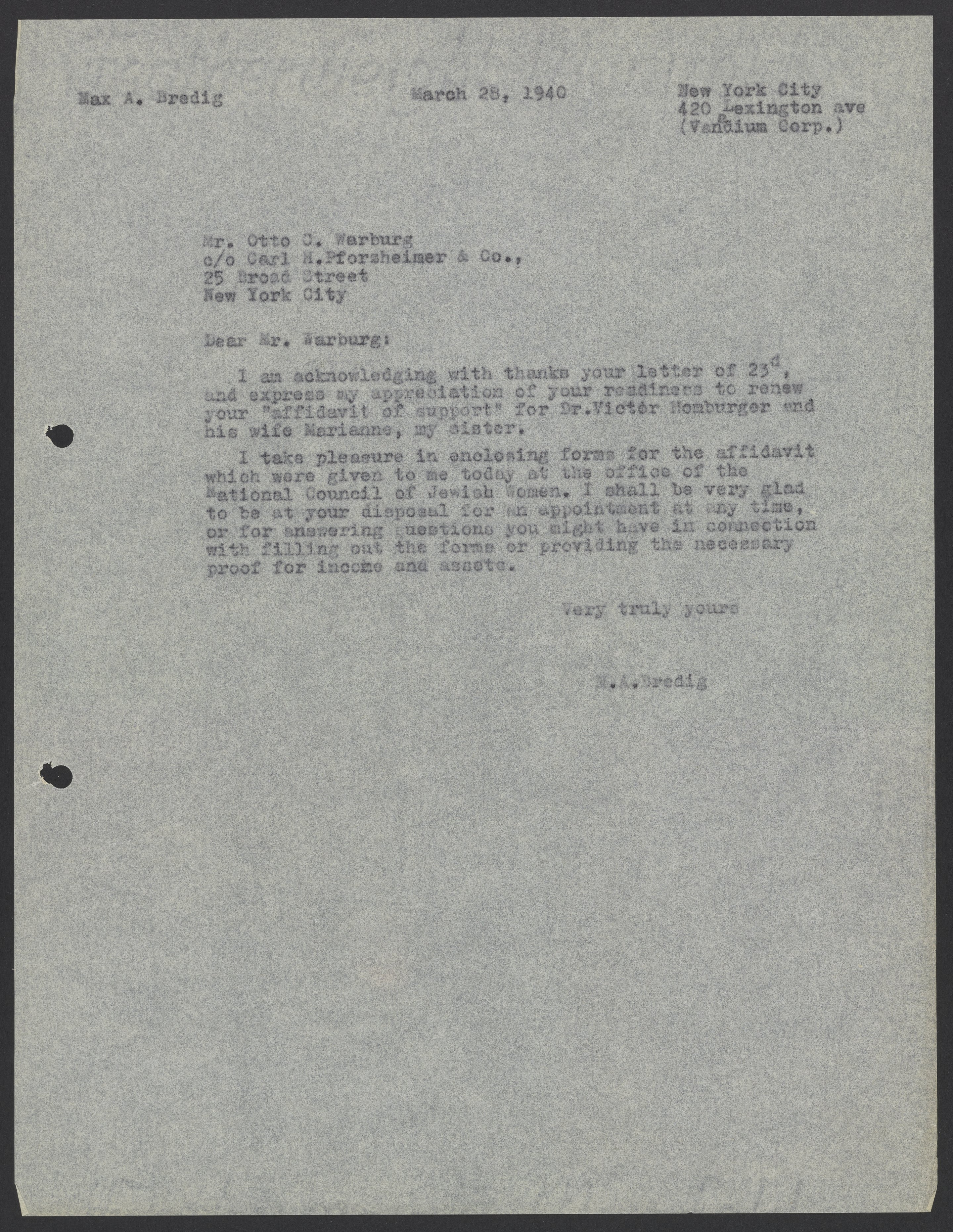 Max Bredig (1902-1977) thanks Otto Warburg for renewing his affidavit to vouch for the immigration of Viktor Homburger (1888-1968) and Marianne Homburger (1903-1986).