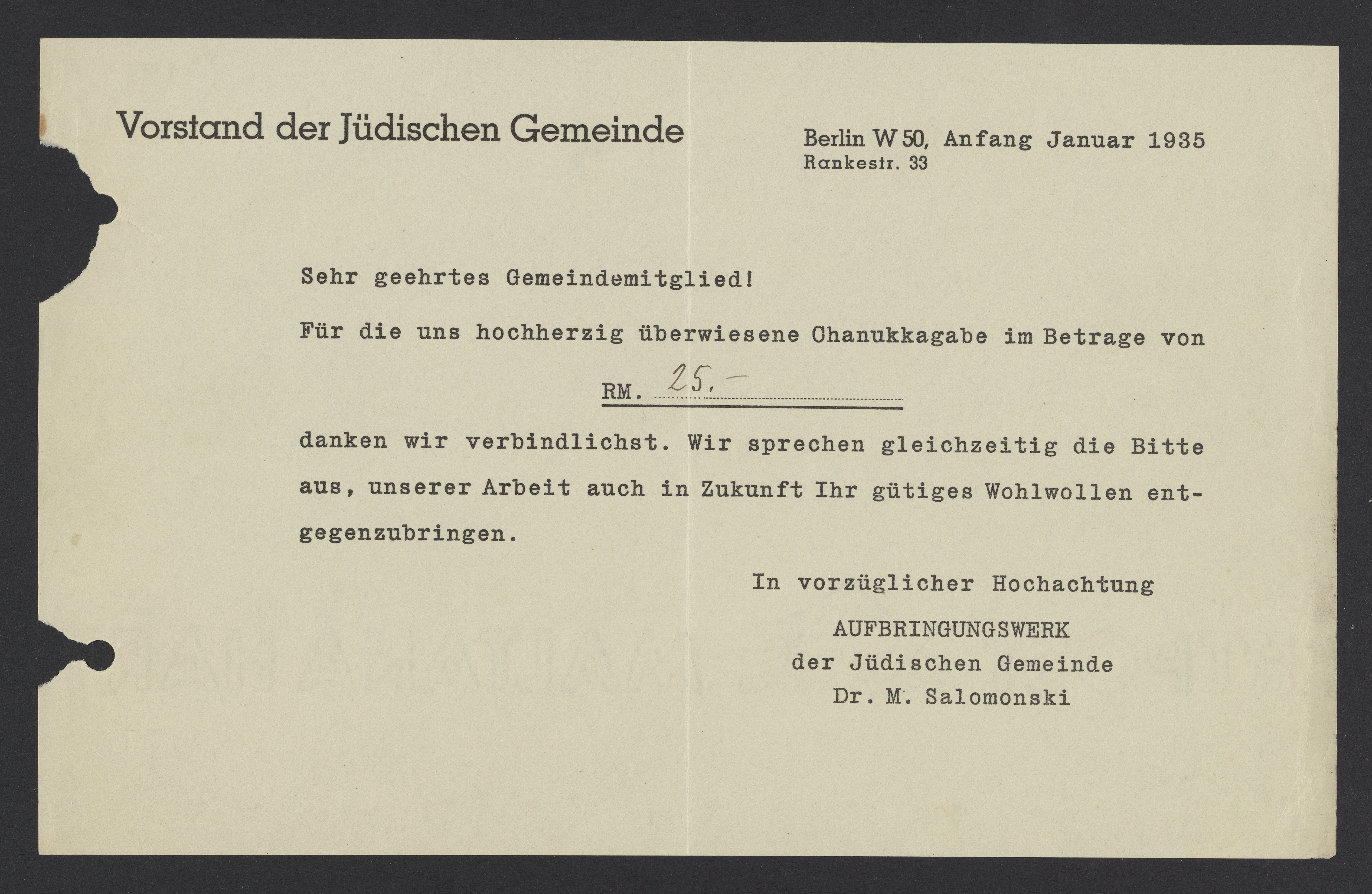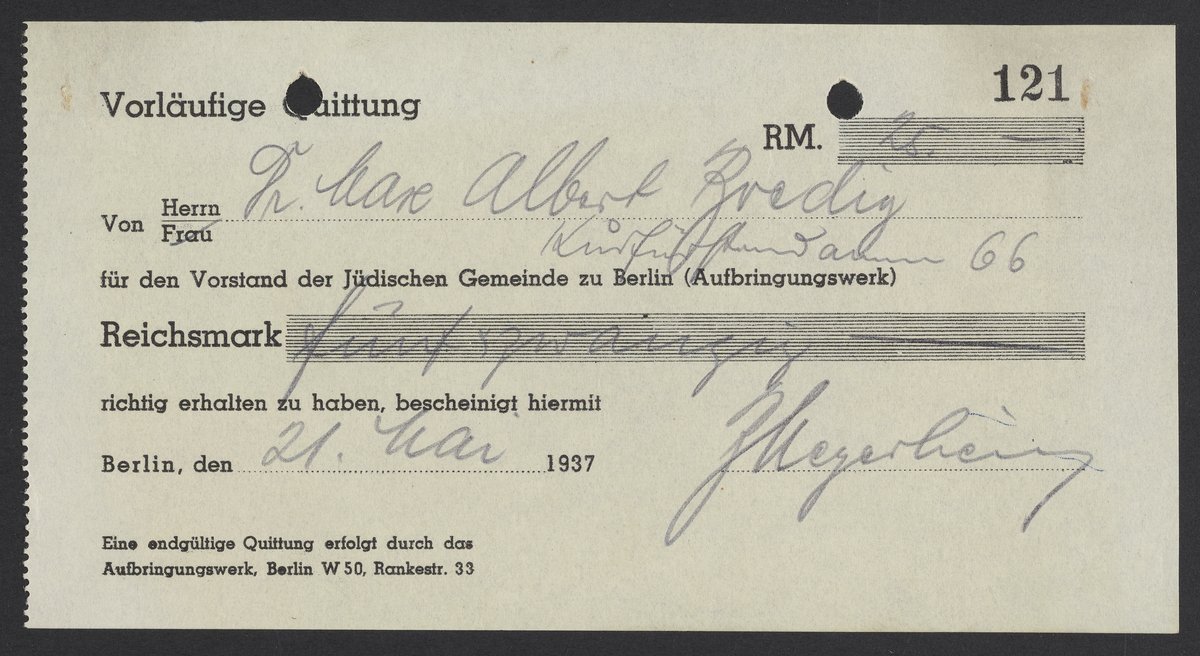 Small JPG1200 x 782px — 115 KBLarge JPG2880 x 1877px — 753 KBFull-sized JPG5908 x 3851px — 3.3 MBOriginal fileTIFF — 5908 x 3851px — 65.1 MBNote thanking Max Bredig (1902-1977) for his donation to the Vorstand der Judischen Gemeinde zu Berlin (Aufbringungswerk), or Board of Directors of the Jewish Community in Berlin (funding agency), and a provisional receipt for the payment.