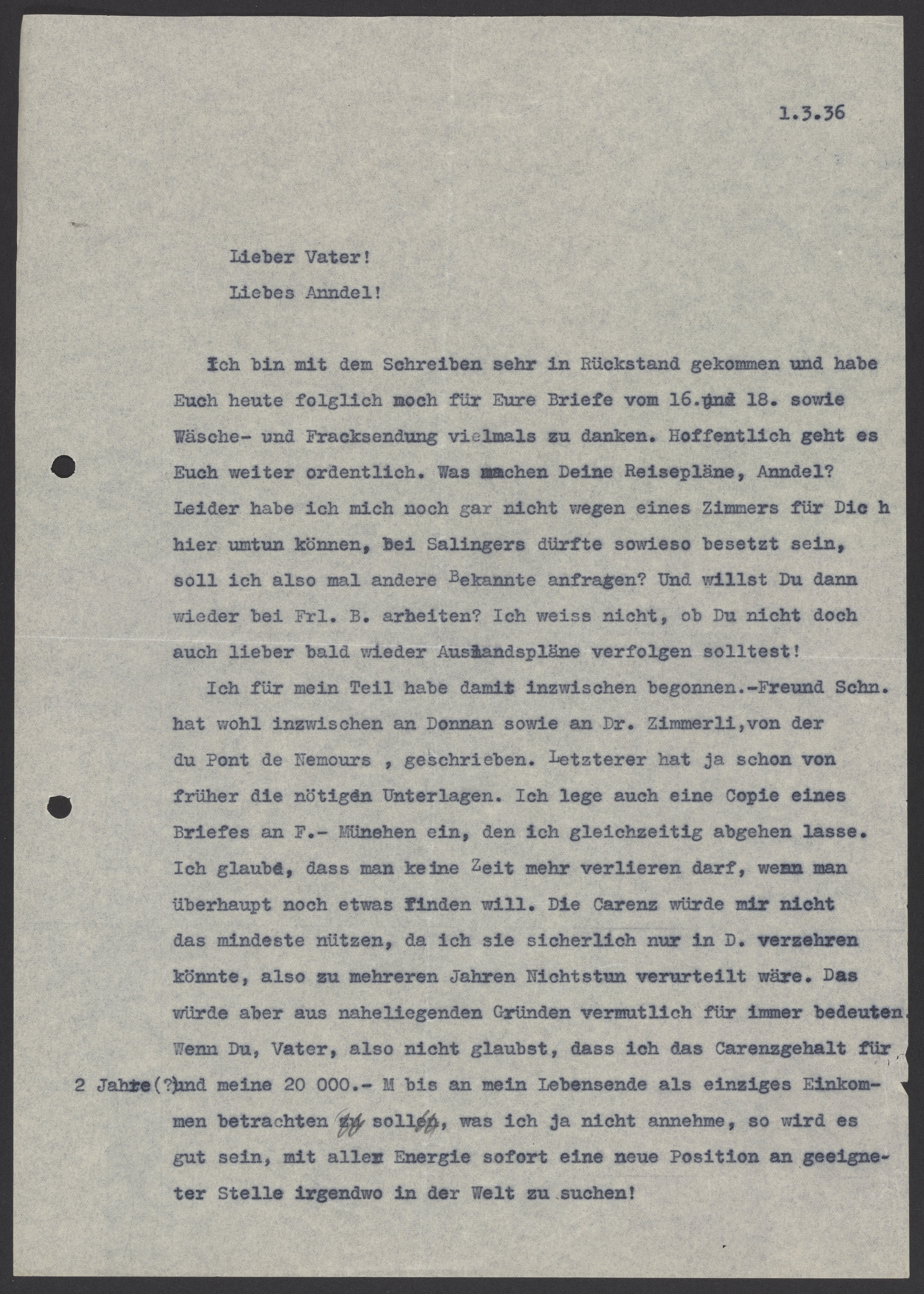 Letter from Max Bredig to Georg Bredig and Marianne Homburger, March 1, 1936