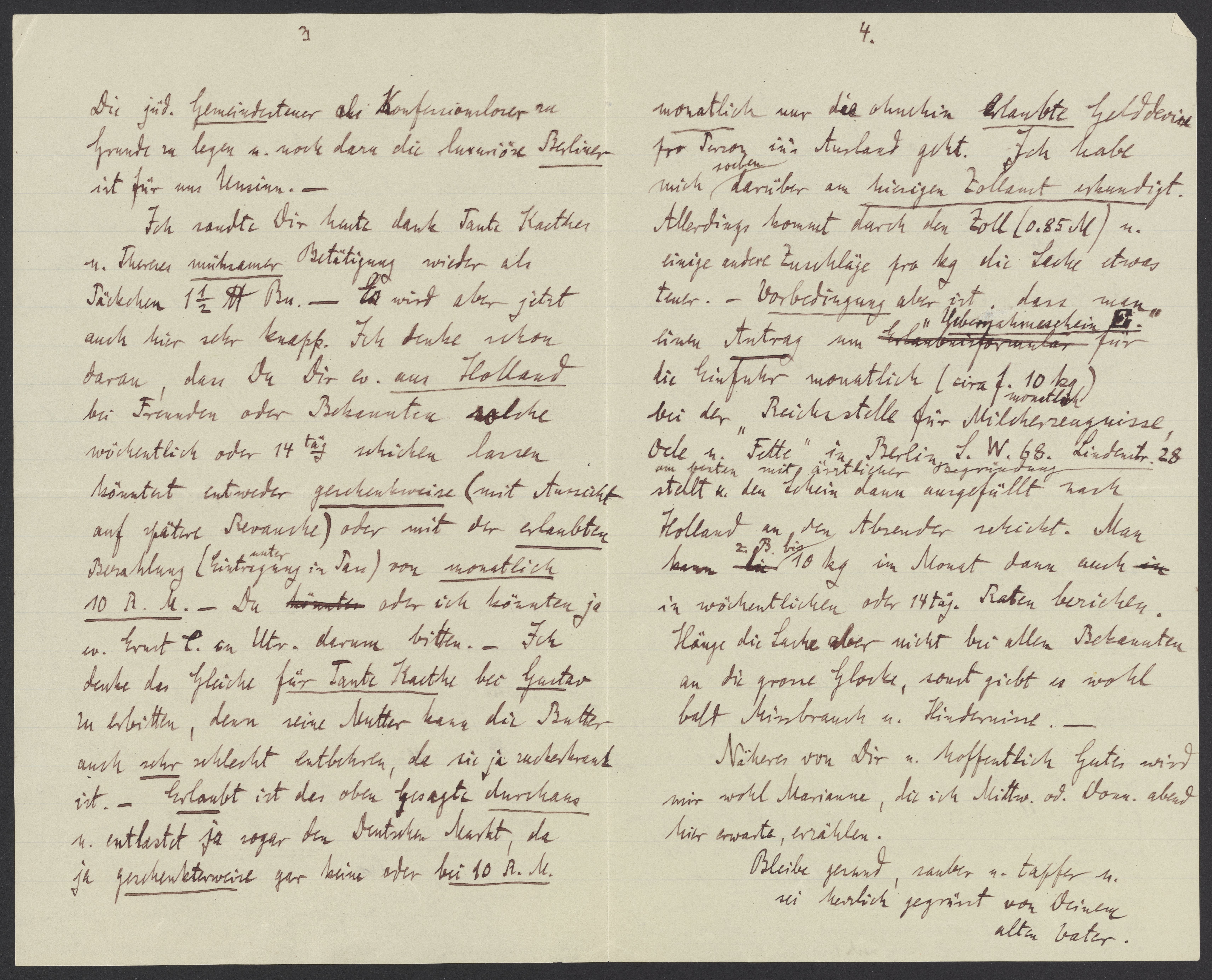 monatlich nur die ohnehin erlaubte Gelddevise pro Person in’s Ausland geht. Ich habe mich soeben darüber am hiesigen Zollamt erkundigt. Allerdings kommt durch den Zoll (0.85 M) u. einige andere Zuschläge pro kg. die Sache etwas teuer. – Vorbedingung aber ist dass man einen Antrag um „Erlaubnisformular“ für die Einfuhr monatlich (circa f. 10 kg monatlich) bei der „Reichstelle für Milcherzeugnisse, Oele u. Fette“ in Berlin S.W. 68 Lindenstr. 28. stellt u. den Schein (am besten mit ärztlicher Begründung) dann ausgefüllt nach Holland an den Absender schickt. Man kann z.B. 10 kg im Monat dann auch in wöchentlich oder 14 tägige Raten beziehen. Hänge die Sache aber nicht bei allen Bekannten an die grosse Glocke, sonst giebt es wohl bald Missbrauch u. Hindernisse.