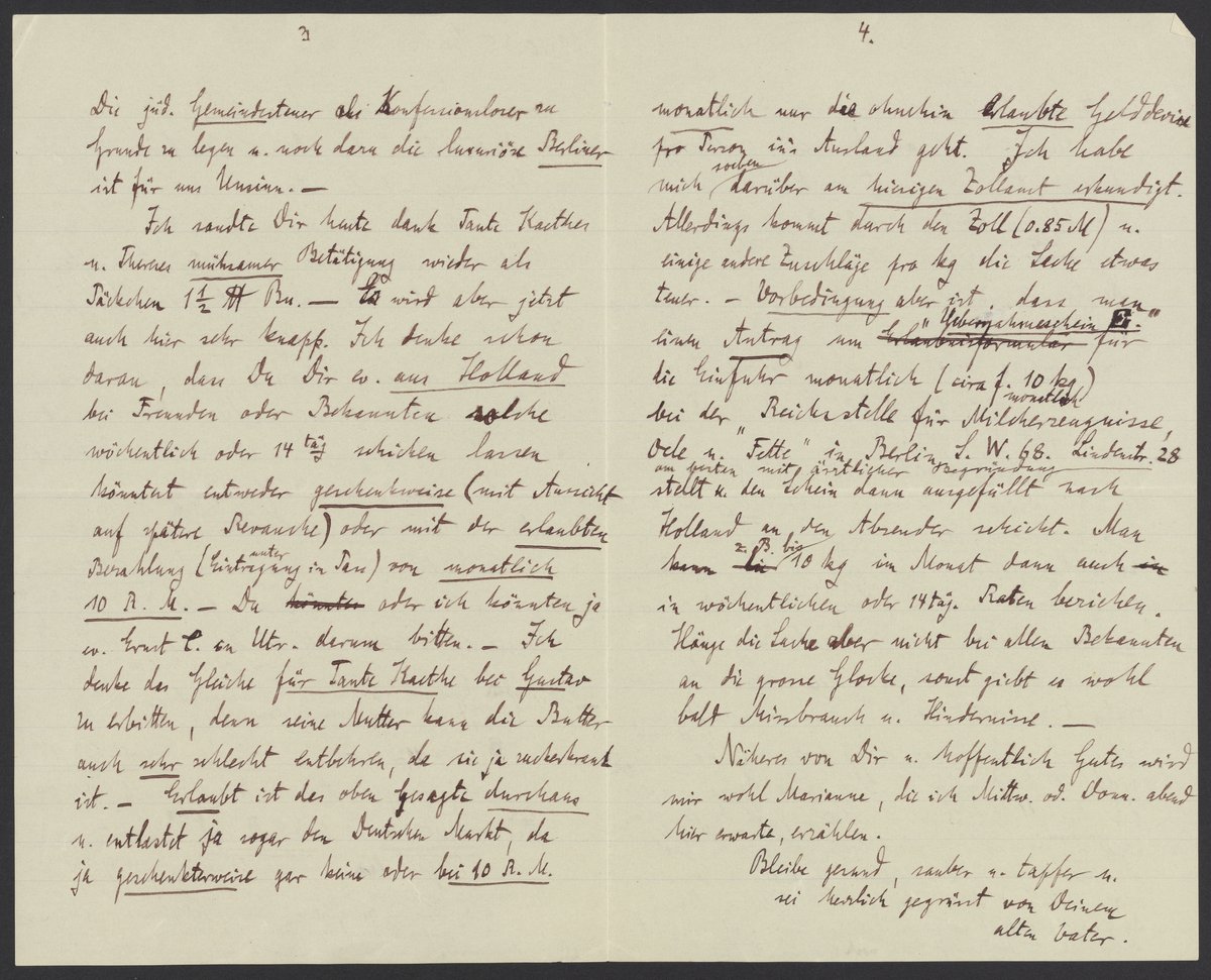 Thanks to Aunt Kaethe's and Therese's painstaking reports, I sent you another 1 ½ pound of butter in a small package today. It’s sparse here too. I think you could possibly have friends or acquaintances from Holland send items weekly or every two weeks either as a gift (with the prospect of revenge at a later time) or as a permitted pre-paid package in the amount of 10 Reichsmarks (with entry in the passport). You or I could possibly ask Ernst Cohen in Utrecht about it. I think I should ask Gustave about the same thing for Aunt Kaethe. His mother can hardly do without the butter either, especially since she is diabetic. What I just mentioned is allowed and even unburdens the German market,