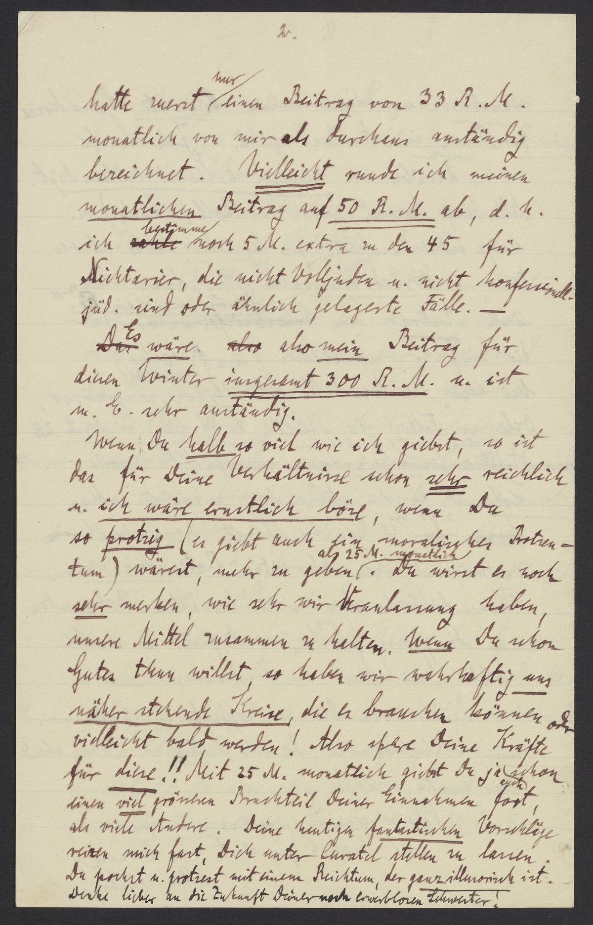 Wenn Du halb so viel wie ich giebst, so ist das für Deine Verhältnisse schon sehr reichlich u. ich wäre ernstlich böse, wenn Du so protzig (es giebt auch ein moralisches Protzentum) wärest, mehr zu geben als 25 M. monatlich. Du wirst es noch sehr merken, wie sehr wir Veranlassung haben, unsere Mittel zusammen zu halten. Wenn Du schon Gutes thun willst, so haben wir wahrhaftig uns näher stehende Kreise, die es brauchen können oder vielleicht bald werden! Also spare Deine Kräfte für diese!! Mit 25 M. monatlich giebst Du ja schon einen viel grösseren Bruchteil Deiner Einkommen fort, als viele Andere. Deine heutigen fantastischen Vorschläge reizen mich fort, Dich unter Curatel stellen zu lassen. Du pochst u protzest mit einem Reichtum, der ganz illusorisch ist. Denken lieber an die Zukunft Deiner noch erwerbslosen Schwester!