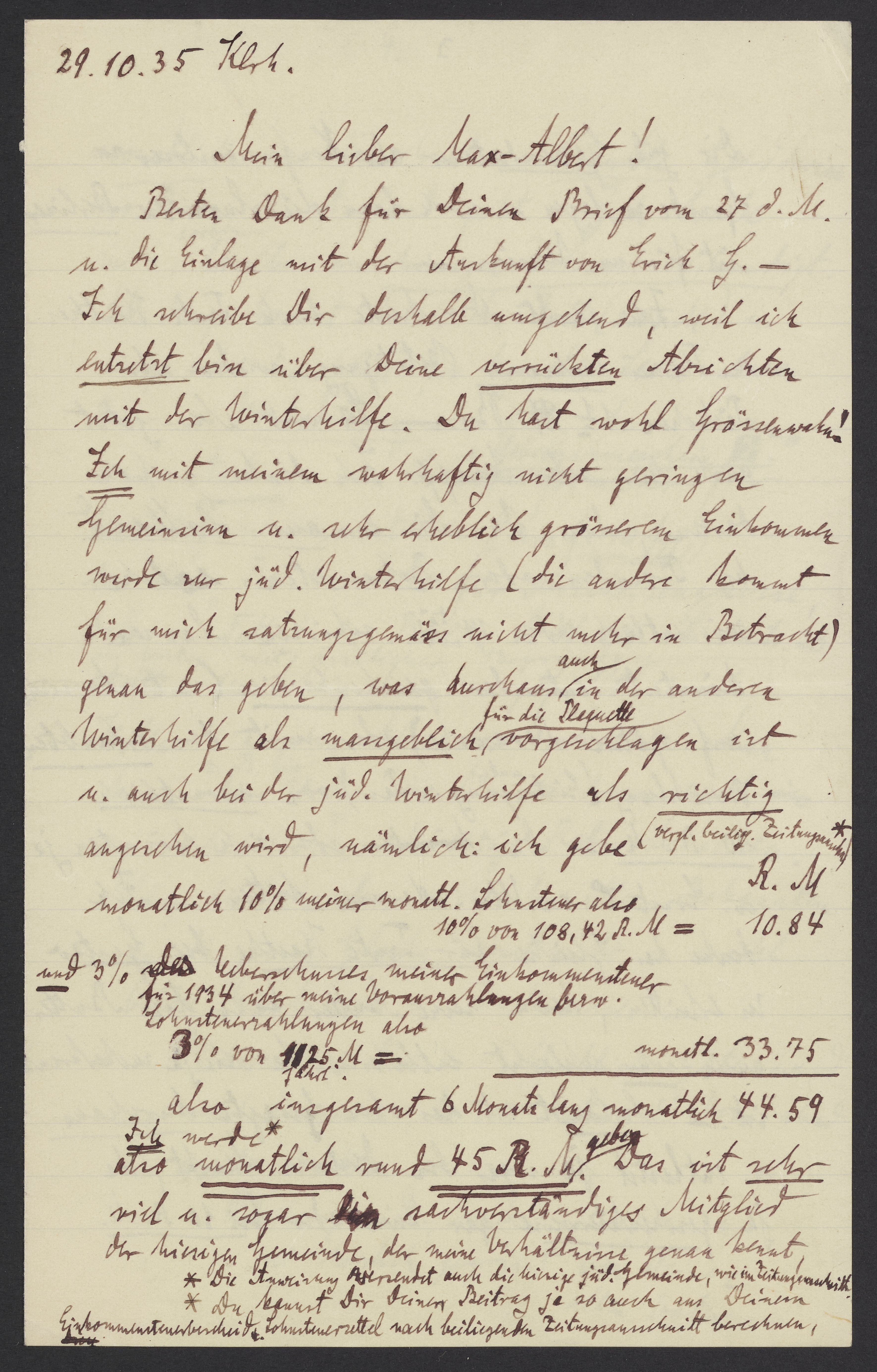 Besten Dank für Deinen Brief vom 27 d.M. u. die Einlage mit der Auskunft von Erich G. – Ich schreibe Dir deshalb umgehend, weil ich entsetzt bin über Deine verrückten Absichten mit der Winterhilfe. Du hast wohl Grössenwahn! Ich mit meinem wahrhaftig nicht geringen Gemeinsinn u. sehr erheblich grösseren Einkommen werde zur jüdische Winterhilfe (die andere kommt für mich satzungsgemäss nicht mehr in Betracht) genau das geben, was durchaus auch in der anderen Winterhilfe als massgeblich vorgeschlagen ist u. auch bei der jüdische Winterhilfe als richtig angesehen wird, nämlich: ich gebe (vergl belieg. Zeitungsausschnitt) monatlich 10% wieder monatlich Lohnsteuer also 10% von 108,42 R.M. = 10.84 und 3% Überschusses meiner Einkommensteuer für 1934 über meine Vorauszahlungen beziehungsweise Lohnsteuerzahlungen also 3% von 1125 M jährlich = monatlich 33.75, also insgesamt 6 Monate lang monatlich 44.59. Ich werde also monatlich rund 45 R.M. geben. Das ist sehr viel und sogar als sachverständiges Mitglied der hiesigen Gemeinde, der meine Verhältnisse genau kennt,