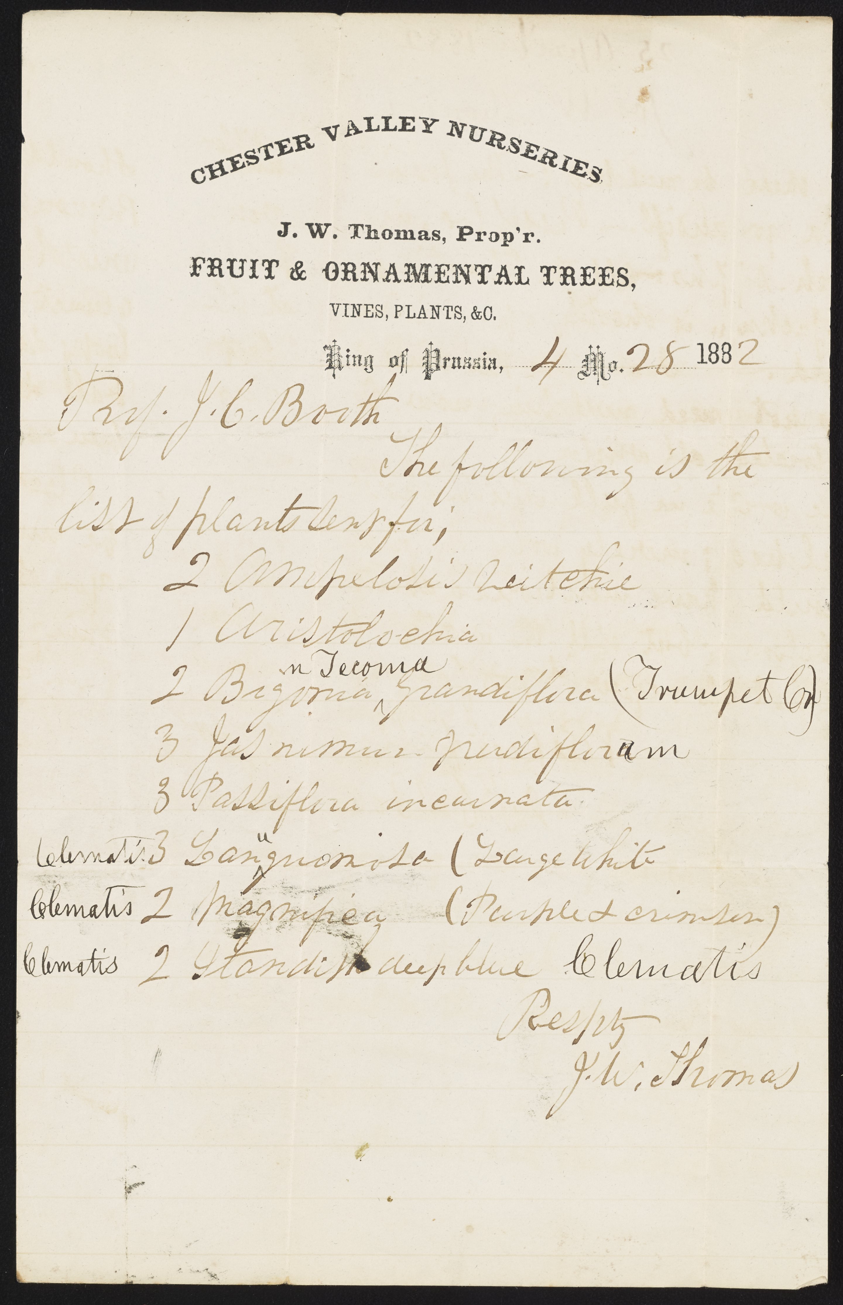Letter from J.W. Thomas to James Curtis Booth, April 28, 1882