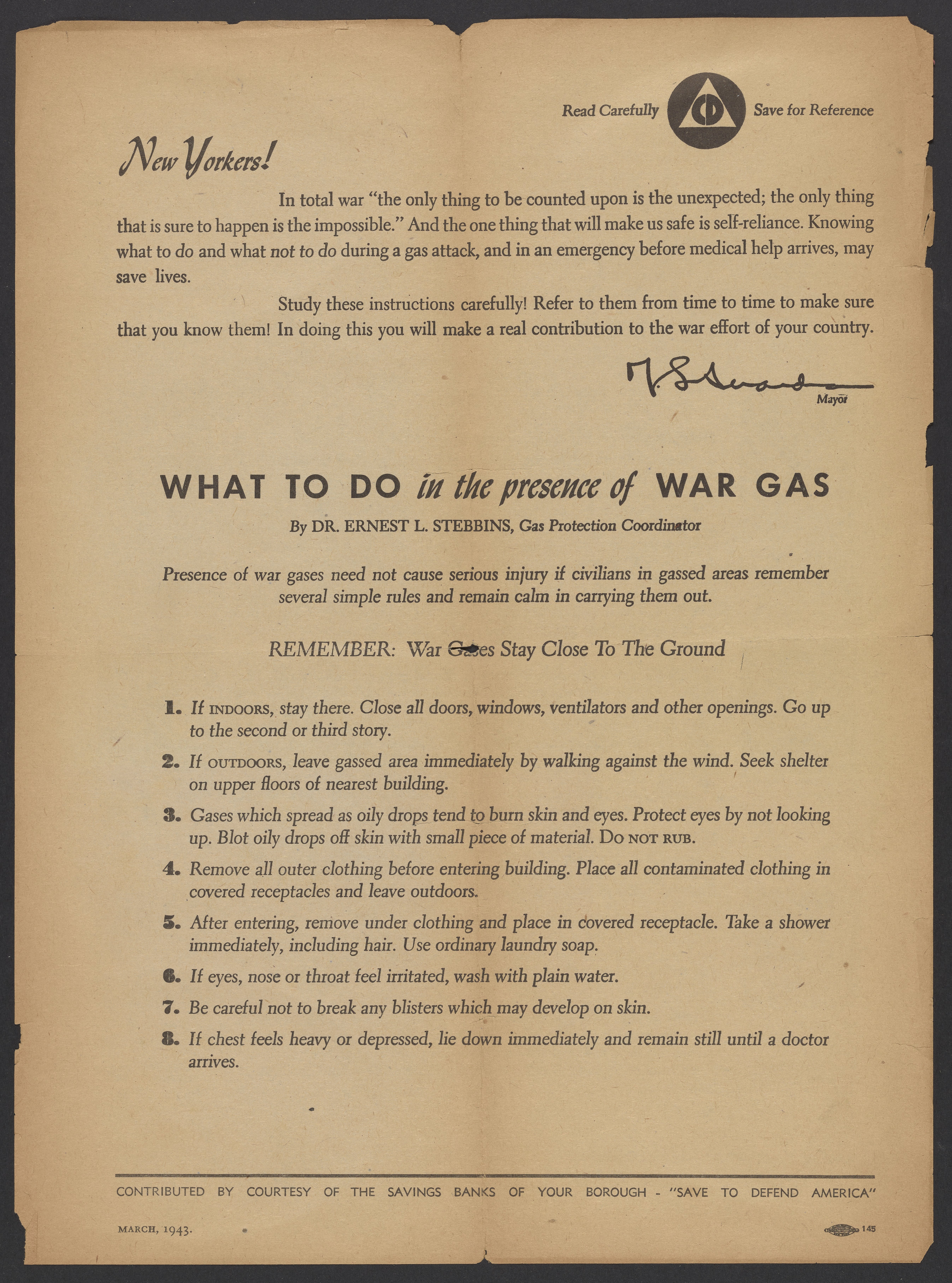 United States. Office of Civilian Defense. “What To Do in the Presence of War Gas,” March 1943. Papers of Georg and Max Bredig, Box 4, Folder 9. Science History Institute. Philadelphia. https://digital.sciencehistory.org/works/myov92v.