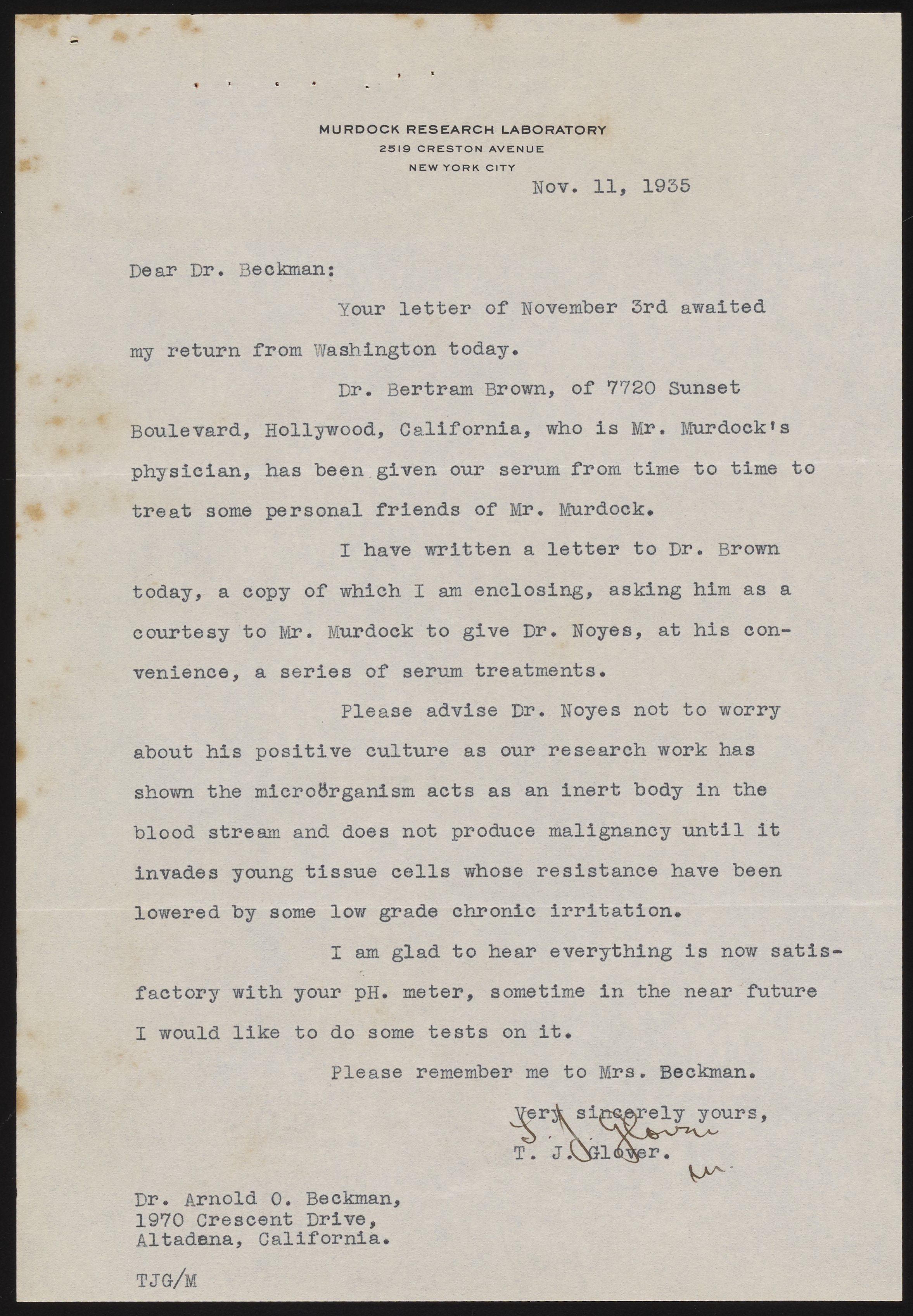Letter from T. J. Glover to Arnold O. Beckman