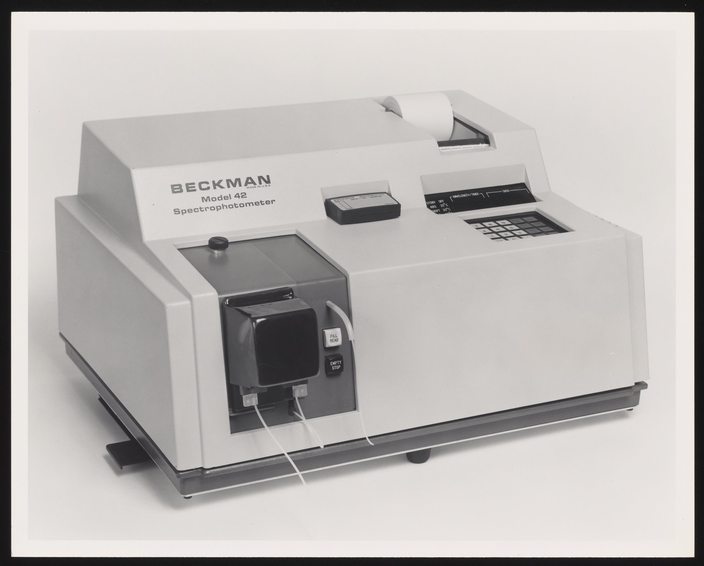 First produced in 1981, the Beckman Model 42 Clinical Spectrophotometer incorporated a UV/visible spectrophotometer, a microprocessor, and a printer into one unit.