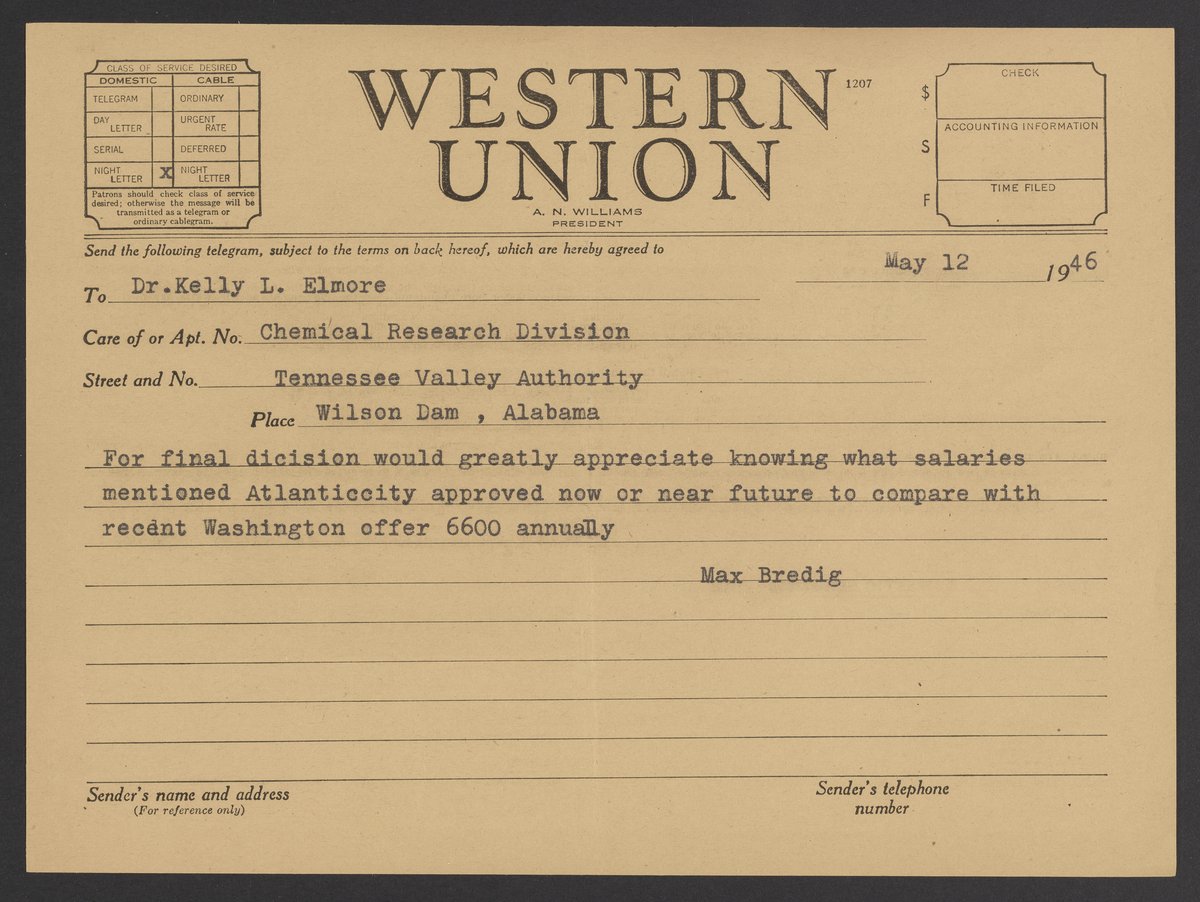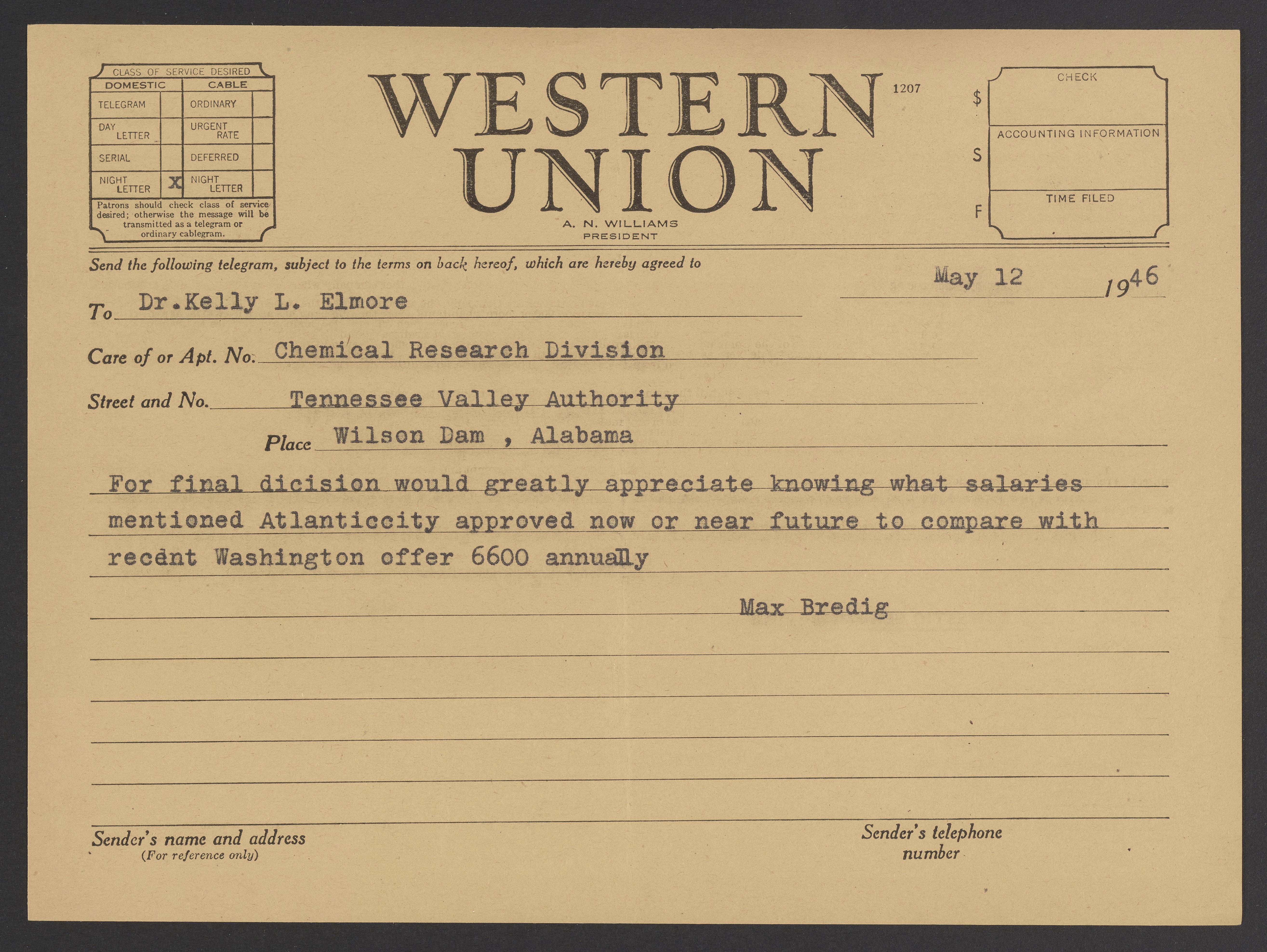 Bredig, Max Albert. “Telegram from Max Bredig to Kelly L. Elmore, May 12, 1946,” May 12, 1946. Papers of Georg and Max Bredig, Box 10, Folder 34. Science History Institute. Philadelphia. https://digital.sciencehistory.org/works/n09ftgc.